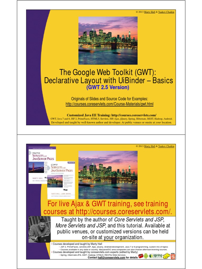 Servlets. JSF 2. Summary: HTML-Based (Eclipse Wizard Builds #1 & #2) 1. JSP. Spring. Java 7 and 8. PrimeFaces. Developed and taught by well-known author and developer. Hibernate.coreservlets. At public venues or onsite at your location. Ajax.com/ GWT. Android.create to bind the Java class to the XML representation – Mark fields with @UiField (one for each ui:field in XML) – Call setElement – Insert content into those fields 3. Hadoop. jQuery. Use new Java class in EntryPoint class – Use DOM API with getElement and appendChild 55 .© 2013 Marty Hall & Yaakov Chaikin Wrap-Up Customized Java EE Training: http://courses. Create XML file – Top-level element is an HTML tag like <div> – Put raw HTML inside – Use ui:field to mark places for later insertion 2. HTML5. REST. Create Java class that represents the XML – Extend UiObject – Use UiBinder interface and GWT.