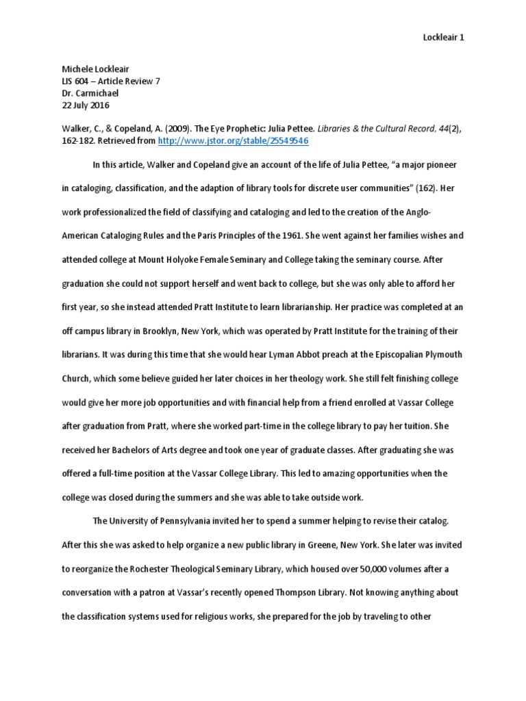 first year, so she instead attended Pratt Institute to learn librarianship. Her practice was completed at an
