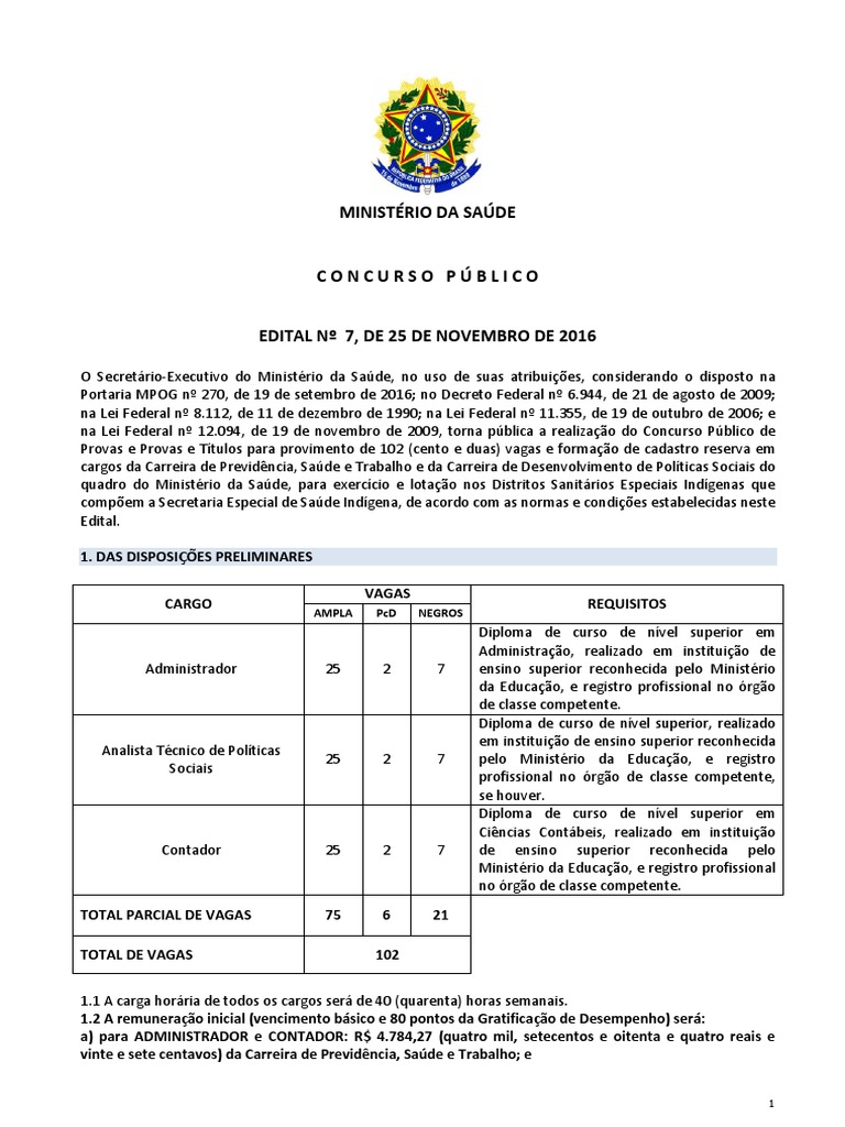 1.5.1 Os candidatos aos cargos deste Concurso Pblico tero uma classificao apenas no DSEI em que se