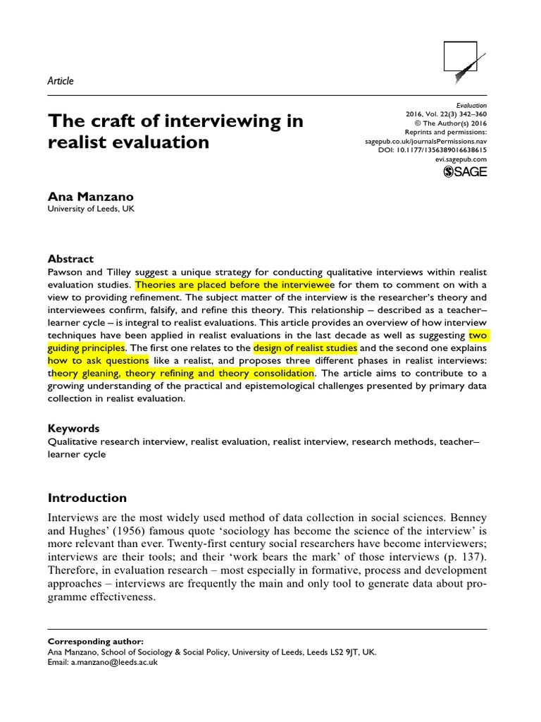 Implementation Science 6: 1–15. CA: SAGE. American Journal of Evaluation 20: 385–8.net/index. CA: SAGE. Journal of Health Organization and Management 28(3): 366–85. Manzano A and Pawson R (2014) Evaluating deceased organ donation: A programme theory approach. Van Belle S. listening and interpreting. 3rd edn. University of Oxford. Pawson R (2013) The Science of Evaluation: A Realist Manifesto. Pawson R and Tilley N (1997) Realistic Evaluation. 1–24. Madill A (2008) Realism. Pawson R (1989) A Measure for Measures: A Manifesto for Empirical Sociology. Morse J (1995) Editorial: The significance of saturation. CA: Jossey-Bass. Qualitative Inquiry 11: 3–15. CA: SAGE. Thousand Oaks. Cambridge. Mason M (2010) Sample size and saturation in PhD studies using qualitative interviews. Kamuzora P and Sansebastian M (2011) Implementing accountability for reasonableness framework at district level in Tanzania: A realist evaluation. Maxwell J (2013) Qualitative Research Design: An Interactive Approach. CA: SAGE. London: SAGE. CA: SAGE. In: May T (ed.au/RE_chapter. Kvale S and Brinkmann S (2009) InterView: Learning the Craft of Qualitative Research Interviewing. Thousand Oaks. CA: SAGE. Pawson R and Manzano-Santaella A (2012) A realist diagnostic workshop. Henry GT and Julnes G (1999) Toward an integrative framework for evaluation practice. MA: Harvard University Press.) The SAGE Encyclopaedia of Qualitative Research Methods. Evaluation 17(1): 21–36.) Qualitative Research in Action. et al. Thousand Oaks.Manzano: The craft of interviewing in realist evaluation 359 Iosifides T (2011) A generic conceptual model for conducting realist qualitative research: Examples from migration studies. In: Roberts H (ed. Manzano-Santaella A (2011) A realistic evaluation of fines for hospital discharges: Incorporating the history of programme evaluations in the analysis. Patton MQ (2002) Qualitative Research and Evaluation Methods. London: Routledge. Patton MQ (2003) Qualitative evaluation checklist. Pawson R (1996) Theorizing the interview. Available at www. Linnan L and Steckler A (2002) Process evaluation for public health interventions and research.com. (2012) Is realist evaluation keeping its promise? A review of published empirical studies in the field of health systems research. Thousand Oaks. Available at: http://www. British Cabinet Office. Maluka S. In: Given L (ed. Mason J (2002) Qualitative interviewing: Asking. San Francisco. 2nd edn. Kvale S (1996) Interviews: An Introduction to Qualitative Research Interviewing. Mark MM. Patton MQ (1999) Realistic evaluation [Review of the book Realistic Evaluation]. wmich. qualitative-research. London: SAGE.) Working Papers. London: Routledge.pdf. Qualitative Health Research 5(2): 147–9. 731–5. .php/fqs/article/view/1428. Available at: http://www. Oxford: Oxford Department of International Development (QEH). American Journal of Evaluation 20: 177–98. International Journal of Social Research Methodology 9: 127–42. London: SAGE. 225–41. Marchal B.) Doing Feminist Research. Pawson R and Tilley N (2004) Realistic evaluation.pdf (accessed 29 February 2016). London: Routledge. Popper K (2002) The Logic of Scientific Discovery. In: Institute IM (ed. Forum Qualitative Sozialforschung/Forum: Qualitative Social Research 11(3).edu/evalctr/checklists/qec. Evaluation 18(2): 192–212. Lawrence-Lightfoot S (2005) A dialogue between art and science. Evaluation 18(2): 176–91. Mishler EG (1991) Research Interviewing: Context and Narrative. Pawson R (2006) Digging for nuggets: How ‘bad’ research can yield ‘good’ evidence. Thousand Oaks. Oakley A (1981) Interviewing women. Thousand Oaks. communitymatters. The British Journal of Sociology 47(2): 295. Van Olmen J. Maxwell J (2012) A Realist Approach for Qualitative Research. Evaluation Checklists Project.