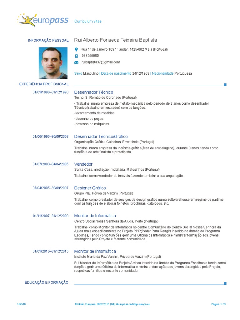 europa.Essentials da Cisco Cinel . jovens e adultos Competências de organização .11 valores 01/09/1988–01/09/1989 Desenhador Técnico Nível 5 QRQ Cenfim .Curriculum vitae 15/09/1987–15/06/1988 Rui Alberto Fonseca Teixeira Baptista 12º Ano . Porto COMPETÊNCIAS PESSOAIS Língua materna português Outras línguas inglês COMPREENDER FALAR ESCREVER Compreensão oral Leitura Interação oral Produção oral B1 B1 B1 B1 B1 Níveis: A1 e A2: Utilizador básico . Porto (Portugal) 01/04/2015–29/04/2015 Certificado de Competências Pedagógicas Área Pedagógica .Curso de Formação Pedagógica Inicial de Formadores.Boa capacidade de interagir com crianças.B1 e B2: Utilizador independente .eu Página 2 / 3 .Grelha de auto-avaliação 15/2/16 © União Europeia.cedefop.Boa capacidade do método de trabalho Competências relacionadas com o trabalho .Centro de Formação.Centro de Formação. Porto (Portugal) Matemática .Boa capacidade de trabalhar em equipa Competência digital AUTOAVALIAÇÃO Processamento de informação Comunicação Utilizador avançado Utilizador avançado Criação de conteúdos Segurança Resolução de problemas Utilizador independente Utilizador avançado Utilizador independente Competências digitais . Porto (Portugal) 02/05/2007–11/05/2007 Curso de IT .Experiência em ministrar formação . Ermesinde (Portugal) 01/01/1994–01/12/1994 Técnico de CAD-CAM Nível 5 QRQ Cesai .C1 e C2: Utilizador avançado Quadro Europeu Comum de Referência para as Línguas Competências de comunicação .Centro de Formação. 2002-2015 | http://europass.Boa capacidade de comunicação .Via Ensino Nível 4 QRQ Agrupamento de Escolas Alexandre Herculano.12 valores Geografia .Boa capacidade de organização .12 valores Biologia .