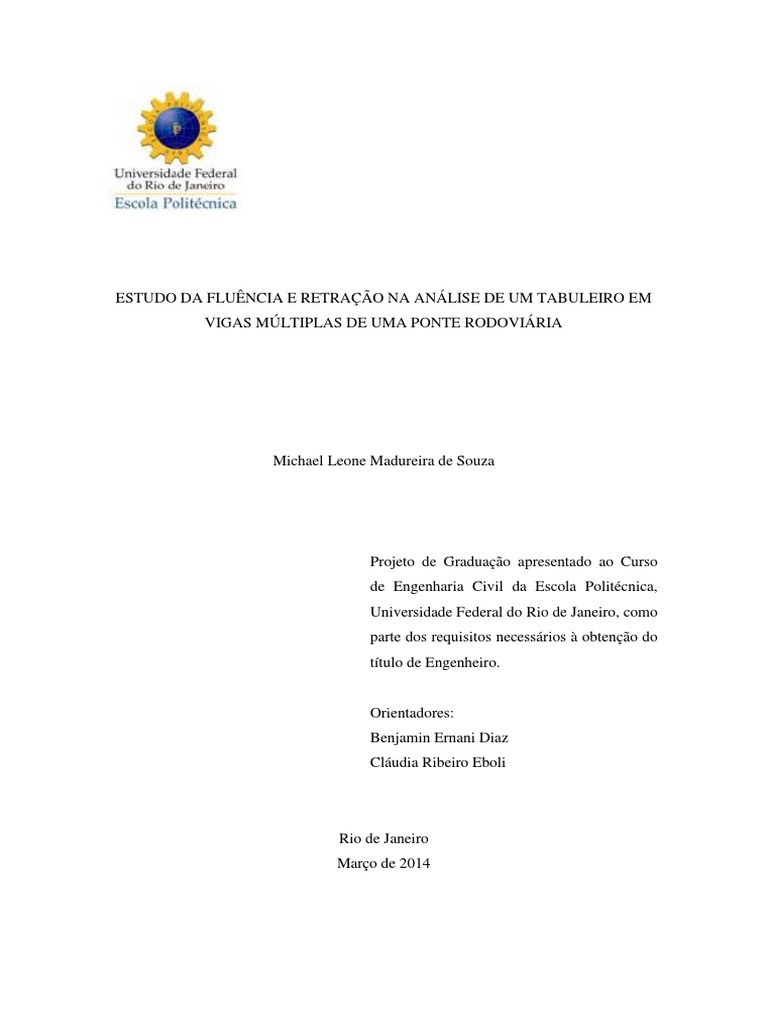 XVIII, 67 p.: Il.; 29,7 cm. Orientadores: Benjamin Ernani Diaz e Claudia Ribeiro Eboli Projeto de Graduação – UFRJ/ Escola Politécnica/ Curso de Engenharia Civil, 2013. Referências Bibliográficas: p. 67 1. Fluência. 2. Retração. 3. Propriedades reológicas. 4. Etapas construtivas. 5. Ponte rodoviária. I. Diaz, Benjamin Ernani, et al. II. Universidade Federal do Rio de Janeiro, Escola Politécnica, Curso de Engenharia Civil. III. Título.