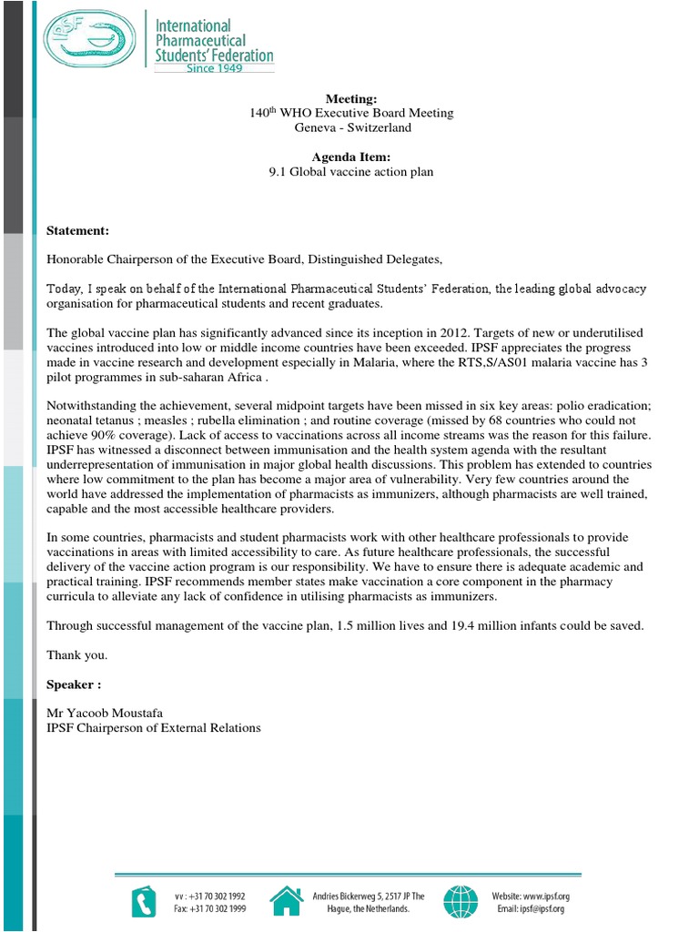 Today, I speak on behalf of the International Pharmaceutical Students Federation, the leading global advocacy