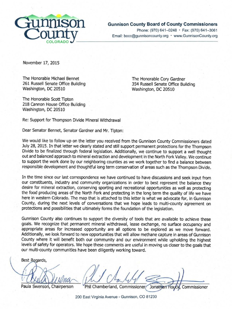 A letter of support of the Thompson Divide Withdrawal and Protection Act of 2017 from Gunnison County Commissioner