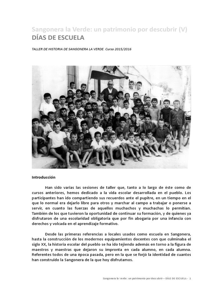 8 . como el “Cara al Sol” o “Viva España”. tanto en la escuela de niñas como en las de niños. seguido de algún canto patrio por parte de todo el grupo. escritura. Después ya se iniciaba la clase. por cierto. comenzaba con el izado de bandera en el mástil por parte de algún alumno o alumna. donde pasaban las horas de lunes a sábado. Excursión escolar al Seminario. atestando unos locales pequeños y sin apenas condiciones. historia política y sagrada. han estado recordando aquel tiempo de infancia frente al pupitre o sentados en las colañas que hacían de banco corrido. interrumpida sólo a media mañana para descansar y tomar un vaso de leche en polvo de la que abastecía en latas la denominada “ayuda americana”. aritmética. debían recibir clase por separado atendiendo enseñanzas consideradas entonces como básicas por la ley imperante. Unas eran idénticas para todos. agricultura. Este abanico de oferta en cuanto a pequeños locales que había en el pueblo respondía al paulatino aumento demográfico. Sangonera la Verde: un patrimonio por descubrir – DÍAS DE ESCUELA . doctrina cristiana o la llamada “formación del espíritu nacional”. industria o comercio para ellos. mañanas y tardes. transcurría la educación primaria en Sangonera y en casi todos los pueblos de nuestro entorno hasta el inicio de los años setenta. Año 1965 El día a día en la escuela Los componentes del Taller que lo vivieron. era la de llevar uniforme (un babi blanco y cinta en el pelo) sólo en el caso de las chicas. La jornada. Y así. Otra distinción. como lectura. labores del hogar para ellas. pero manteniendo el modelo escolar “unitario” donde niños y niñas. revueltos pero no juntos. aunque mezclados en edad. formando grupos que llegaban a superar largamente el centenar de alumnos. pero otras diferentes según el sexo: nociones en dibujo.
