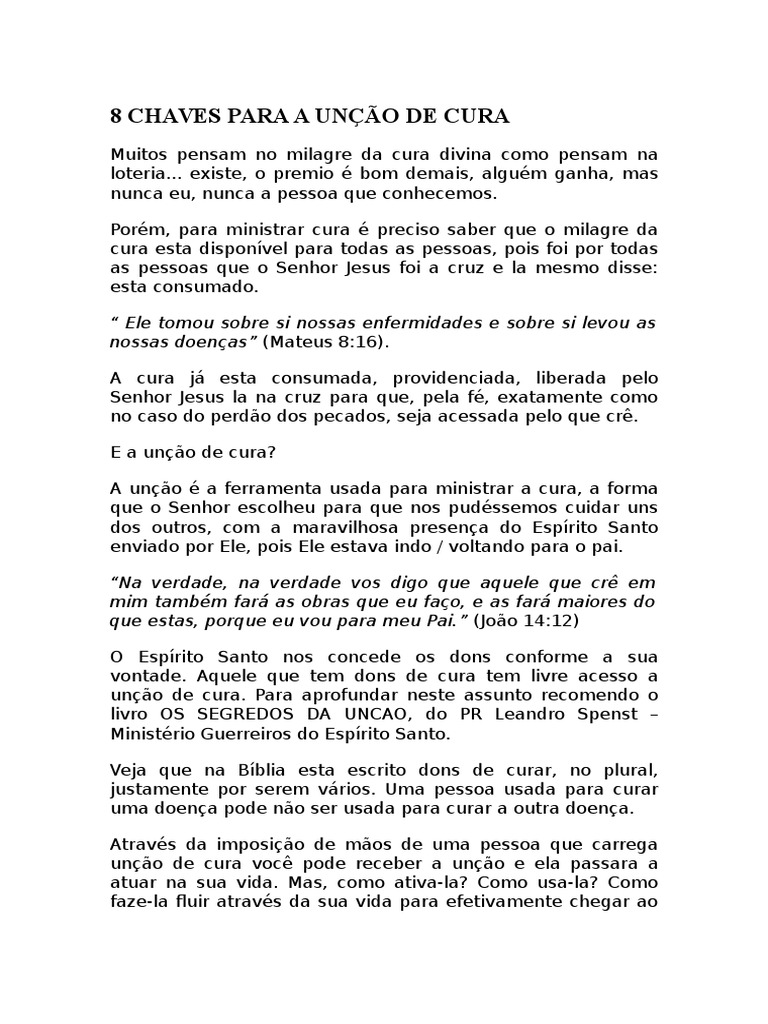 . (Mateus 8:17) E o que acontece com você? Você passa a carregar a unção especifica na qual você foi usado ou usada. a minha oração para que você seja muito mais usado ou usada em curas do que eu sou. Vamos lembrar a palavra? “E assim se cumpriu o que fora dito pelo profeta Isaías: Ele tomou sobre si as nossas enfermidades e sobre si levou as nossas doenças". 2000 anos atrás. mas agora e entre eles! E Ele cura QUALQUER doença! E o que vai acontecer nesta situação? Olha so que incrível.. mas so pode existir e funcionar porque a cura foi consumada por Jesus na cruz. servir assim ao Senhor! . poderá impor as mãos e imparti-la para muitas pessoas e com visão de reino e salvação. nunca com egoísmo. certo? Veja so como o Senhor e maravilhoso: muitas vezes ao receber o Evangelho a pessoa sente amor e gratidão ao Senhor Jesus e a cura já acontece antes mesmo de você orar. Por que? Para glorificar o Senhor Jesus e porque Deus esta vigiando para que sua palavra se cumpra. junto com esta revelação. Ainda que você não possua unção para a cura da doença que a pessoa tem o Espírito Santo fará fluir esta nova unção através de você para que chegue na pessoa.Me permita compartilhar aquilo que o Senhor me revelou e receba. Lembra da primeira chave? Pregar o Evangelho! A unção e ferramenta. Sabe o motivo? Porque quando a pessoa entende que o Senhor Jesus sacrificou-se em seu lugar e recebeu a doença na cruz para providenciar a cura que ela recebe agora. isso passa a ser entre a pessoa e o Senhor Jesus! Você foi usado ou usada para colocar a pessoa nas mãos do Senhor Jesus.