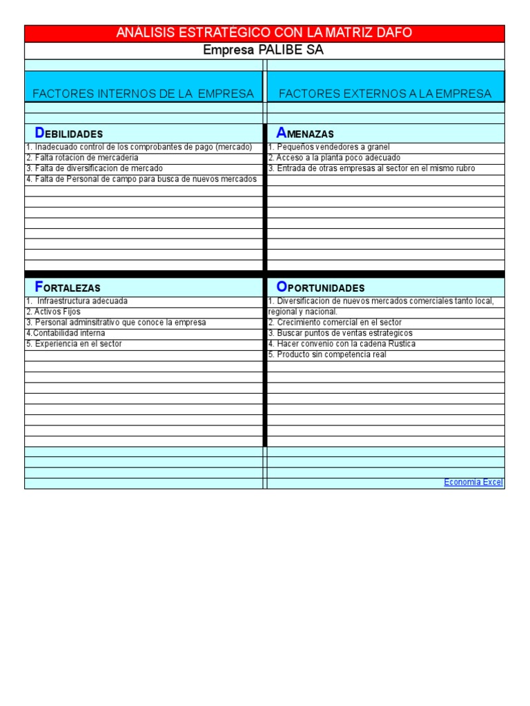 1 2 0.2 2 0. Disminución tasas de interes 0.05 tecnología.15 2 0. utilizando las oportunidades para enfrentar las amenazas .15 3 0. Bajos costos por nueva 0.35 4 Muy Importante 3 Importante Calificar entre 1y 4 2 Poco Importante 1 Nada Importante El análisis sectorial a través de la matriz EFI arroja un resultado… De una calificación de 2 quiere decir que la empresa no está en condiciones adecuadas Donde los factores de Amenazas más importante son: Sobre oferta en el mercado Donde los factores de oportunidades más importantes son: Políticas de exportación Cuando el Indice total es mayor a 2.45 4. MATRIZ EFE (FACTORES EXTERNOS) EMPRESA… Calificación Factores Peso Calificación Ponderada AMENAZAS 50% 1.05 1 0. Políticas de exportación 0.5 Totales 100% 2.2 1 0. Demanda ascendente. 3. Tratados de Libre Comercio 0.5 se considera que la empresa está en condiciones de afrontar el entorno de manera adecuada.4 2.3 OPORTUNIDADES 50% 1.45 económicas 2.2 3. Sobre oferta en el mercado 0. 0.15 3 0. Cambios en las políticas 0.