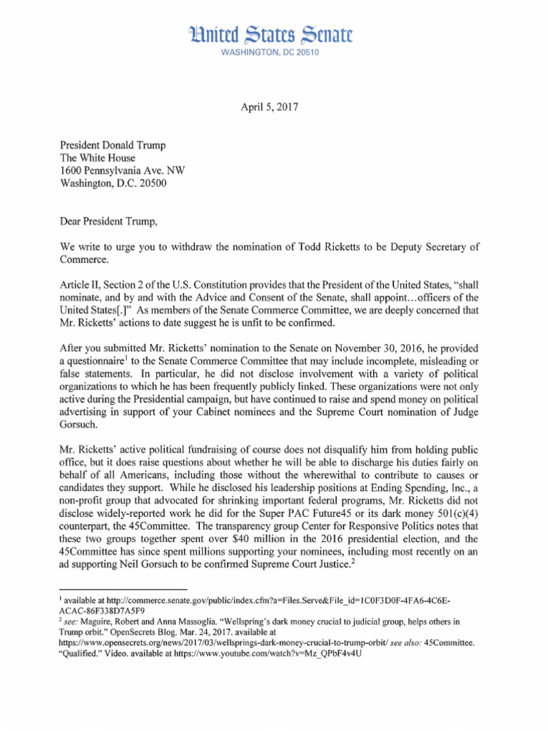 Udall, Blumenthal, Markey Call on Trump to Withdraw Todd Ricketts’ Nomination to be Deputy Commerce Secretary