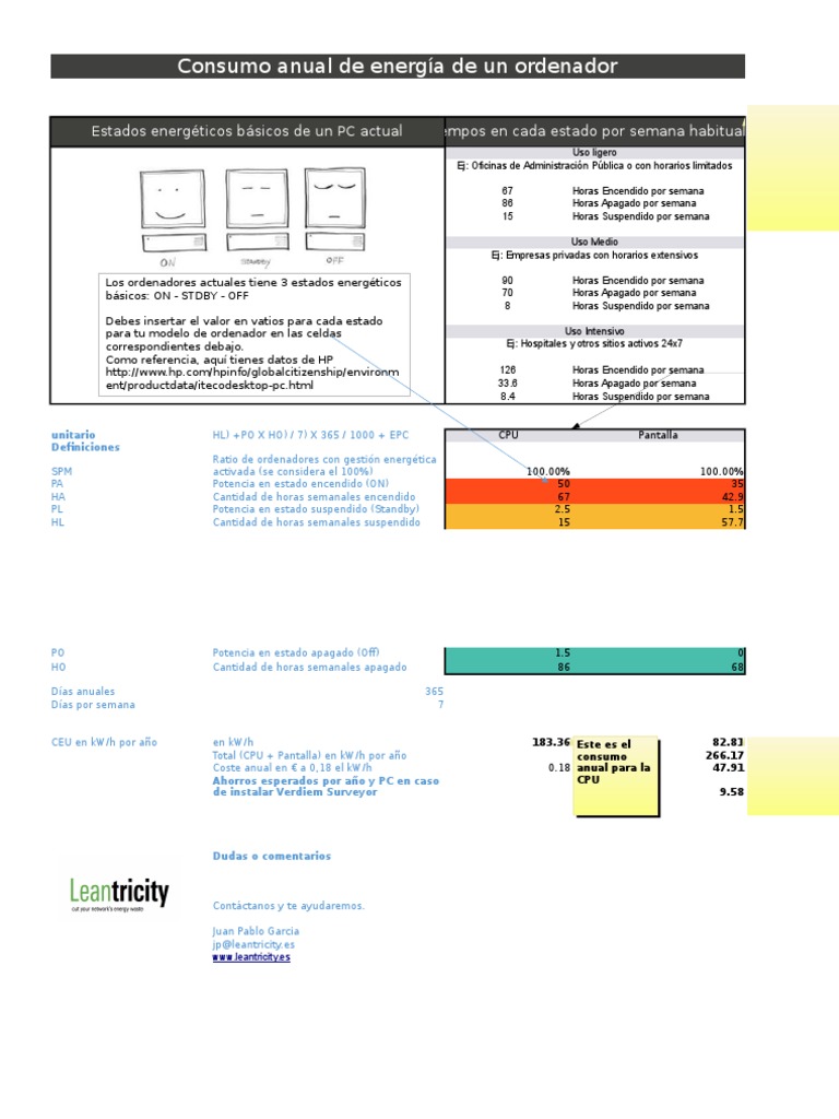 91 para la Ahorros esperados por año y PC en caso CPU pantalla de instalar Verdiem Surveyor 9.5 0 HO Cantidad de horas semanales apagado 86 68 Días anuales 365 Días por semana 7 Consumo unitario medio por dispositivo y año CEU en kW/h por año en kW/h 183.17 consumo anual Coste anual en € a 0.36 Este es el 82.58 Dudas o comentarios Contáctanos y te ayudaremos. Juan Pablo Garcia jp@leantricity.18 anual para la 47.es www.18 el kW/h 0.es .leantricity.PO Potencia en estado apagado (Off) 1.81 Este es el Total (CPU + Pantalla) en kW/h por año consumo 266.