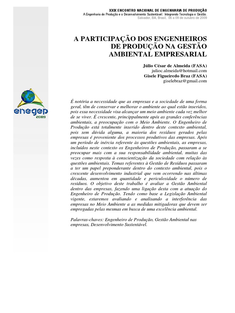 Palavras-chaves: Engenheiro de Produção, Gestão Ambiental nas empresas, Desenvolvimento Sustentável.