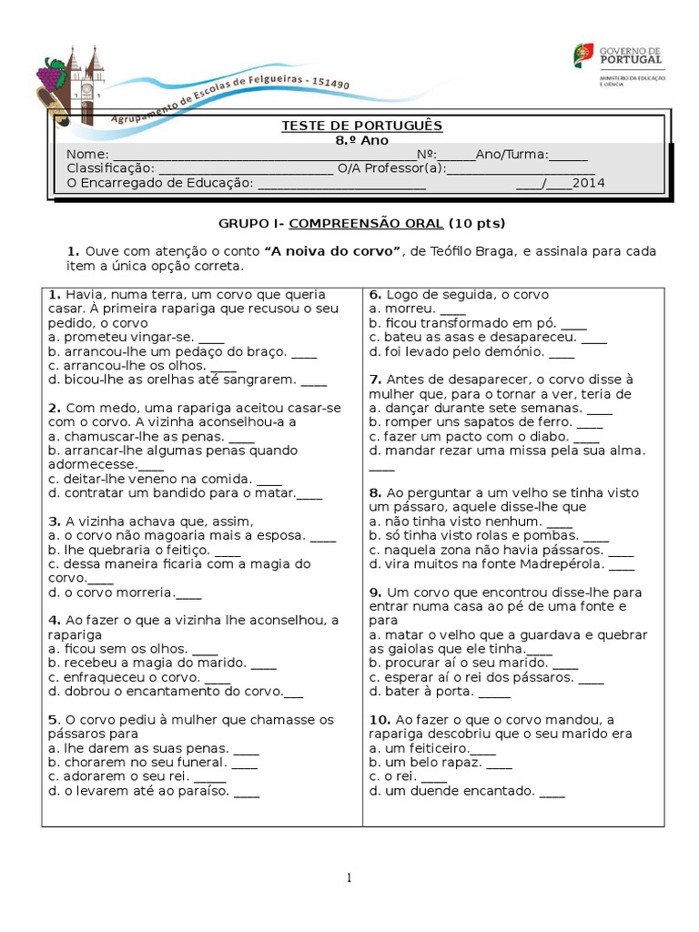 1. Ouve com ateno o conto A noiva do corvo, de Tefilo Braga, e assinala para cada