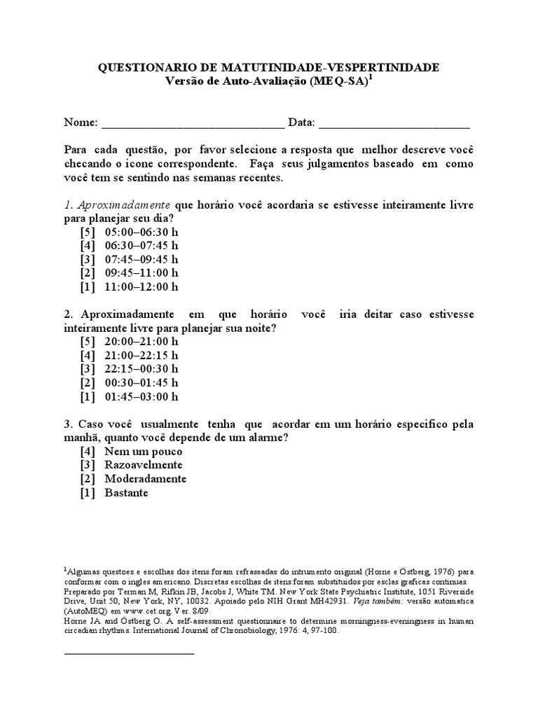 Algumas questoes e escolhas dos itens foram refraseadas do intrumento original (Horne e stberg, 1976) para