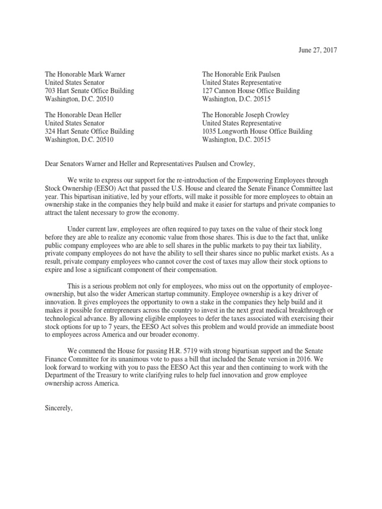 June 27, 2017 The Honorable Mark Warner The Honorable Erik Paulsen United States Senator United States Representative 703 Hart Senate Office Building 127 Cannon House Office Building Washington, D.C. 20510 Washington, D.C. 20515 The Honorable Dean Heller The Honorable Joseph Crowley United States Senator United States Representative 324 Hart Senate Office Building 1035 Longworth House Office Building Washington, D.C. 20510 Washington, D.C. 20515 Dear Senators Warner and Heller and Representatives Paulsen and Crowley, We write to express our support for the re-introduction of the Empowering Employees through Stock Ownership (EESO) Act that passed the U.S. House and cleared the Senate Finance Committee last year. This bipartisan initiative, led by your efforts, will make it possible for more employees to obtain an ownership stake in the companies they help build and make it easier for startups and private companies to attract the talent necessary to grow the economy. Under current law, employees are often required to pay taxes on the value of their stock long before they are able to realize any economic value from those shares. This is due to the fact that, unlike public company employees who are able to sell shares in the public markets to pay their tax liability, private company employees do not have the ability to sell their shares since no public market exists. As a result, private company employees who cannot cover the cost of taxes may allow their stock options to expire and lose a significant component of their compensation. This is a serious problem not only for employees, who miss out on the opportunity of employee-ownership, but also the wider American startup community. Employee ownership is a key driver of innovation. It gives employees the opportunity to own a stake in the companies they help build and it makes it possible for entrepreneurs across the country to invest in the next great medical breakthrough or technological advance. By allowing eligible employees to defer the taxes associated with exercising their stock options for up to 7 years, the EESO Act solves this problem and would provide an immediate boost to employees across America and our broader economy. We commend the House for passing H.R. 5719 with strong bipartisan support and the Senate Finance Committee for its unanimous vote to pass a bill that included the Senate version in 2016. We look forward to working with you to pass the EESO Act this year and then continuing to work with the Department of the Treasury to write clarifying rules to help fuel innovation and grow employee ownership across America. Sincerely,