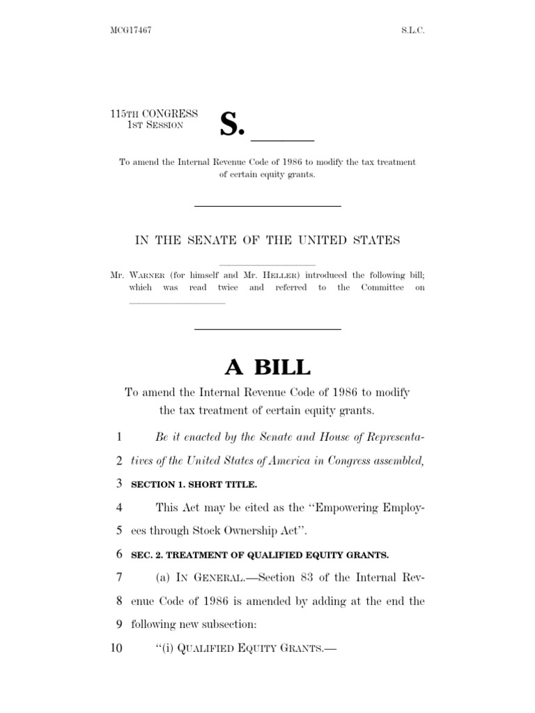 To amend the Internal Revenue Code of 1986 to modify the tax treatment of certain equity grants.