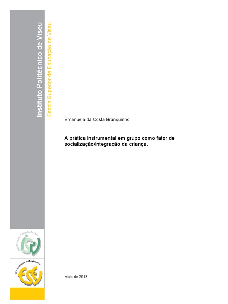 The following document refers to the Internship Final Report and is presented within the Master’s Degree in Early Childhood Education and Teaching in Primary Education. It is intended to demonstrate the accomplished course/path through the stages of the internship in the Basic Education as well as in Preschool Education, during the second and third Semesters. Throughout the Internship carried out in the Basic Education it was possible to realize that children express a great empathy towards Musical Expression and that, in addition to developing skills related to this area, it allows the child a wider contact between the group itself, which encourages the mutual aid and the integration of the child. Thus, we elaborated a study case regarding the instrumental practice and its contribution for the socialization/integration of the child in the Extra Curricular Activities, in Basic Education. The study was based on data gathered through nonparticipating direct observation and semi structured interviews. The participants of the study were a 4 th Grade class, the Extra Curricular Activities Music teacher and four teachers from Basic Education. Throughout the enquiry/study it has been concluded that Music is an influential factor on the integration/socialization of the child. When children have contact with Music, it becomes clear that this brings multiple benefits and capabilities develops, both socially and learning, of utmost importance.
