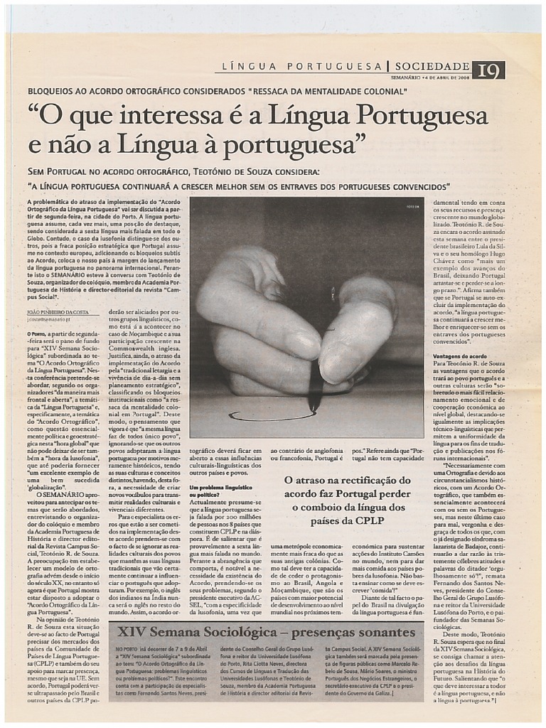 O que interessa é a Língua Portuguesa Description : Realizou-se na Universidade Lusófona do Porto na segunda semana de Abril de 2008 a "XIV Semana Sociológica da ACSEL subordinada ao tema "O Acordo Ortográfico da Língua Portuguesa". O SEMANÁRIO aproveitou para antecipar os temas que serão abordados, entrevistando o organizador do colóquio e membro da Academia Portuguesa de História e diretor editorial da revista Campus Social, Teotónio R. de Souza. Frisou que no contexto e realidade das forças económicas e outras dentro da CPLP, "o que interessa é a Língua Portuguesa e não a Língua à portuguesa".