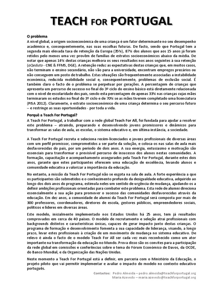 Contactos: Pedro Almeida pedro.almeida@teachforportugal.org