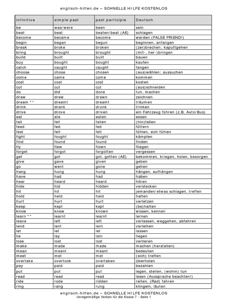 Unregelmäßige Verben für die Klasse 7 - Seite 1