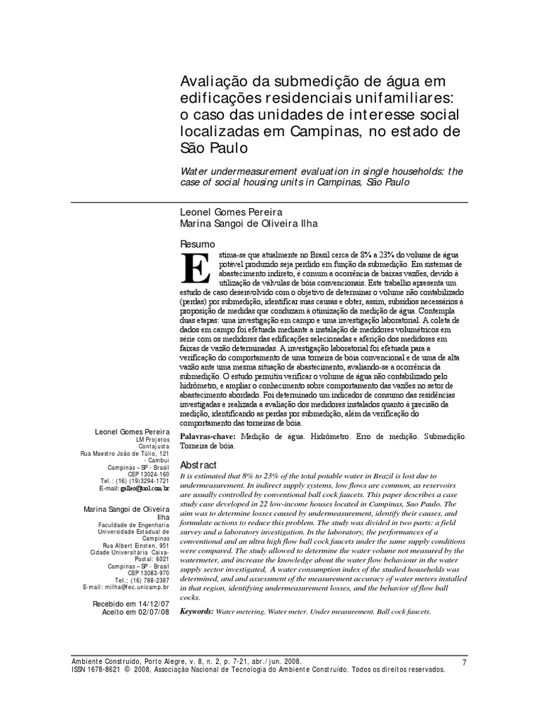 duas etapas: uma investigação em campo e uma investigação laboratorial. A coleta de dados em campo foi efetuada mediante a instalação de medidores volumétricos em série com os medidores das edificações selecionadas e aferição dos medidores em faixas de vazão determinadas. A investigação laboratorial foi efetuada para a verificação do comportamento de uma torneira de bóia convencional e de uma de alta vazão ante uma mesma situação de abastecimento, avaliando-se a ocorrência da submedição. O estudo permitiu verificar o volume de água não contabilizado pelo hidrômetro, e ampliar o conhecimento sobre comportamento das vazões no setor de abastecimento abordado. Foi determinado um indicador de consumo das residências investigadas e realizada a avaliação dos medidores instalados quanto à precisão da medição, identificando as perdas por submedição, além da verificação do comportamento das torneiras de bóia.