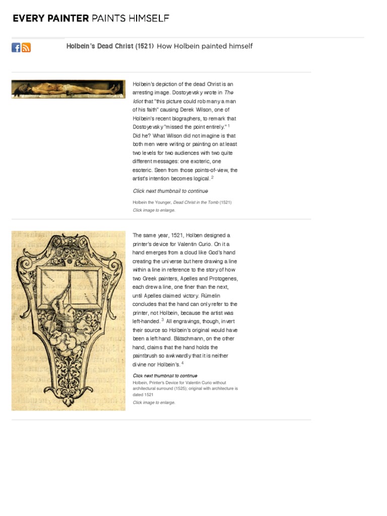 Holbein’s depiction of the dead Christ is an arresting image. Dostoyevsky wrote in The Idiot that "this picture could rob many a man of his faith" causing Derek Wilson, one of Holbein's recent biographers, to remark that Dostoyevsky "missed the point entirely." 1 Did he? What Wilson did not imagine is that both men were writing or painting on at least two levels for two audiences with two quite different messages: one exoteric, one esoteric. Seen from those points-of-view, the artist's intention becomes logical. 2