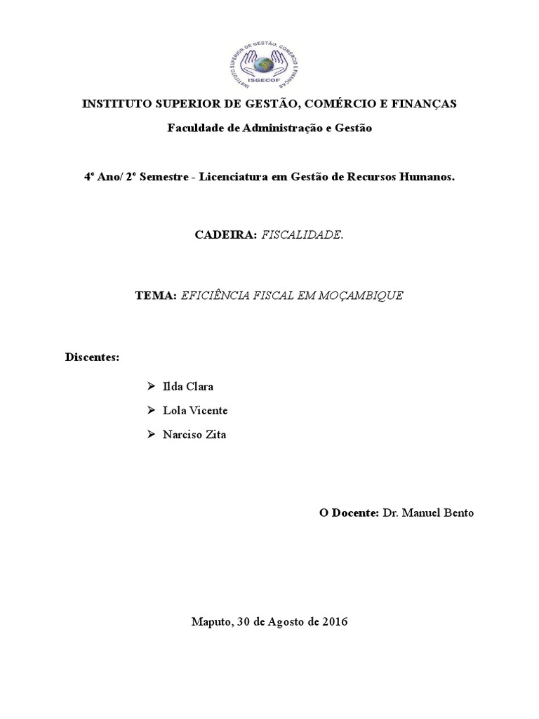 Trabalho, cujo ttulo principal a Eficincia Fiscal em Moambique, seguido de vrios