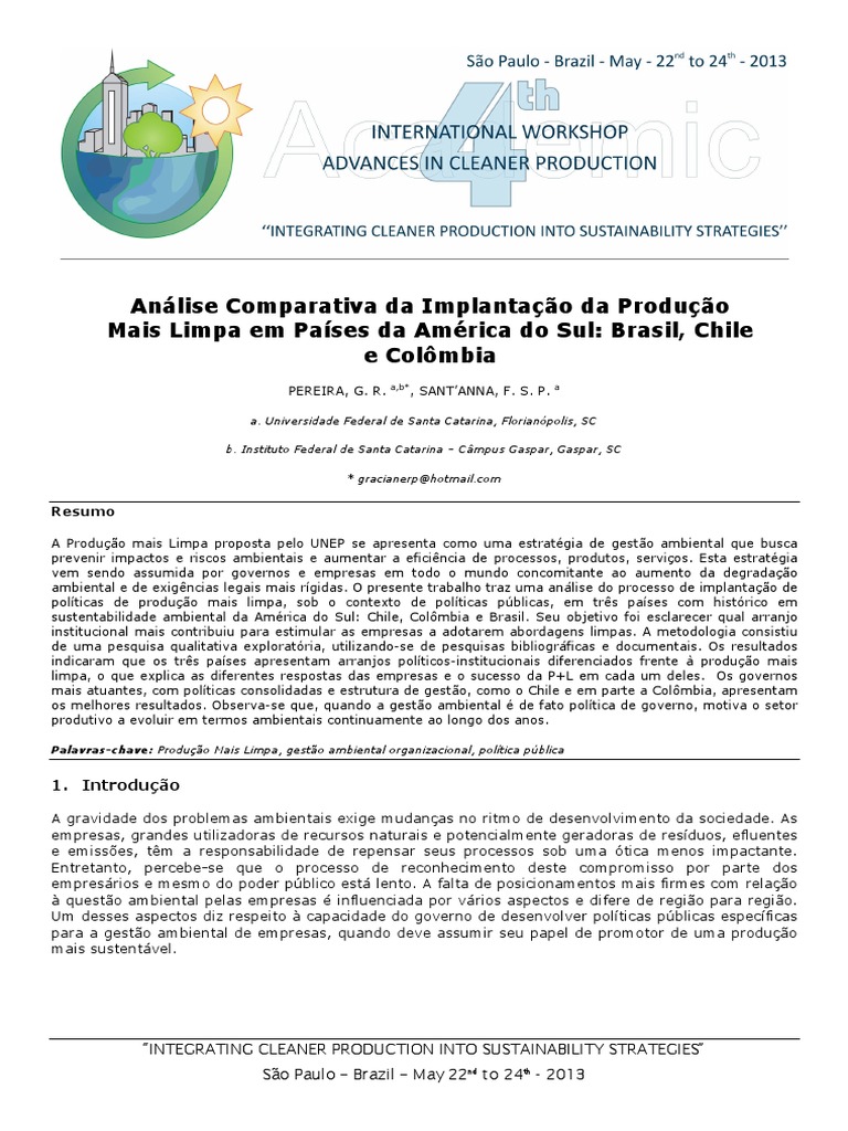 São Paulo – Brazil – 20 – 22 May 2009. Acessado em Abril/2012.. Acessado Agosto/2010 _____. 2010. Acessado em Fevereiro/2013. Panorama de aplicação da norma ISO 14001 no Brasil. Sao Paulo – Brazil.10 4th International Workshop | Advances in Cleaner Production – Academic Work MMA. W. Acessado em Setembro/2012. HERRERA./Apr. São Paulo – Brazil – 18 – 20 May de 2011. Barreiras à Implementação de Produção Mais Limpa Como Prática de Ecoeficiência em Pequenas e Médias Empresas no Estado do Rio de Janeiro. PmaisL – Rede Brasileira de Produção mais Limpa: Relatório 10 anos de parceria. PACHECO. vol. Disponível em: < http://www. Tecnologías Limpias em la industria minero-metalúrgica.pdf>.pdf>.gov.pdf>.R. MAGRINI. Disponível em: <http://www. Acessado em Agosto/2012 VAN HOOF.html>.fr/scp/cp/>.pmaisl. A. BARATA.1 São Carlos Jan. Disponível em: <http://www. POMBO. M. “INTEGRATING CLEANER PRODUCTION INTO SUSTAINABILITY STRATEGIES” São Paulo – Brazil – May 22nd to 24th . J. Disponível em: <http://www. Acessado em Abril/2012.unep. In III International Workshop Advances in Cleaner Production: CLEANER PRODUCTION INITIATIVES AND CHALLENGES FOR A SUSTAINABLE WORLD. United Nations Environment Programme.tecnologiaslimpias.php?ido=conteudo. Cleaner Production at an Environmental Agency: 15 Years of Experience at CETESB. La evolución y el futuro de La producción más limpia en Colombia. 2010.paho.br/scielo.bvsde. ____. F. Portaria nº 454. Acessado em Fevereiro/2012.mma. Revista de Ingeniería.mma. In II International Workshop Advances in Cleaner Production: CLEANER PRODUCTION INITIATIVES AND CHALLENGES FOR A SUSTAINABLE WORLD. F. RIBEIRO. Prod. Resource Efficient and Cleaner Production.gov. Bart.br/sitio/index. UNEP.scielo.cl/chile/chile_marcolegprodlimp. Carlos Manuel..monta&idEstrutura=234>. Bogotá.php?pid=S0104- 530X2008000100002&script=sci_arttext>.unep. Colombia.org>. T. Plano de Produção e Consumo Sustentável – PPCS. Dezembro de 2007.15 no.2013 . Gest. SEBRAE/CEBDS. ____. Acessado em Agosto/2011.br/estruturas/243/_arquivos/ plano_de_ao_para_pcs___documento_para_consulta_243. <Disponível em http://www. de 28/11/2003. Universidad de los Andes. Disponível em: <http://www. Comitê Gestor de Produção mais Limpa.com. Disponível em <http://www.br/publicacoes/relatorio_10anos. M. F.org/bvsacd/cd38/Brasil/PMMA454-03. M. M. B. ROSSI. Comitê Gestor Nacional de Produção e Consumo Sustentáveis. 2008. Disponível em: <http://www. Portaria 44/08.