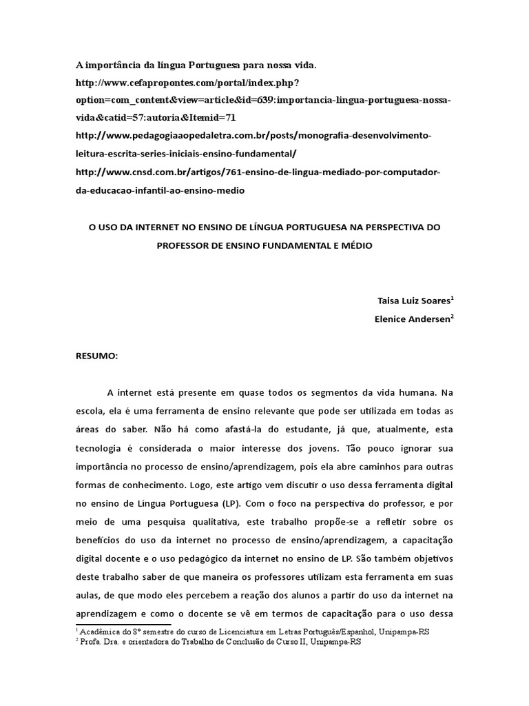 pedaggico da internet no ensino de Lngua Portuguesa, na perspectiva do professor.
