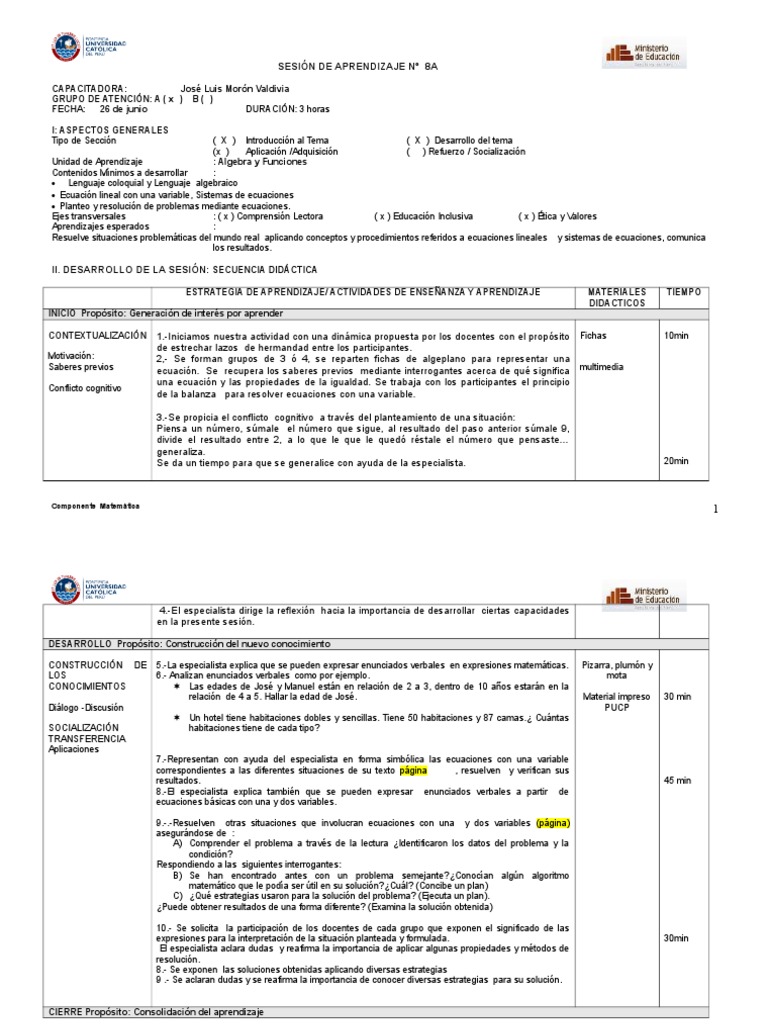 45 min 8.-Resuelven otras situaciones que involucran ecuaciones con una y dos variables (página) asegurándose de : A) Comprender el problema a través de la lectura ¿Identificaron los datos del problema y la condición? Respondiendo a las siguientes interrogantes: B) Se han encontrado antes con un problema semejante?¿Conocían algún algoritmo matemático que le podía ser útil en su solución?¿Cuál? (Concibe un plan) C) ¿Qué estrategias usaron para la solución del problema? (Ejecuta un plan).Analizan enunciados verbales como por ejemplo. dentro de 10 años estarán en la relación de 4 a 5. ¿Puede obtener resultados de una forma diferente? (Examina la solución obtenida) 10.-Representan con ayuda del especialista en forma simbólica las ecuaciones con una variable correspondientes a las diferentes situaciones de su texto página . plumón y LOS 6.. resuelven y verifican sus resultados. CIERRE Propósito: Consolidación del aprendizaje Componente Matemática 2 .¿ Cuántas SOCIALIZACIÓN habitaciones tiene de cada tipo? TRANSFERENCIA Aplicaciones 7.Se aclaran dudas y se reafirma la importancia de conocer diversas estrategias para su solución. 9.Se solicita la participación de los docentes de cada grupo que exponen el significado de las expresiones para la interpretación de la situación planteada y formulada. Material impreso 30 min Diálogo -Discusión PUCP Un hotel tiene habitaciones dobles y sencillas.. DESARROLLO Propósito: Construcción del nuevo conocimiento CONSTRUCCIÓN DE 5. 4.. 8.Se exponen las soluciones obtenidas aplicando diversas estrategias 9 . mota CONOCIMIENTOS Las edades de José y Manuel están en relación de 2 a 3. Hallar la edad de José.-.-El especialista dirige la reflexión hacia la importancia de desarrollar ciertas capacidades en la presente sesión..-La especialista explica que se pueden expresar enunciados verbales en expresiones matemáticas. Pizarra. 30min El especialista aclara dudas y reafirma la importancia de aplicar algunas propiedades y métodos de resolución.-El especialista explica también que se pueden expresar enunciados verbales a partir de ecuaciones básicas con una y dos variables. Tiene 50 habitaciones y 87 camas.