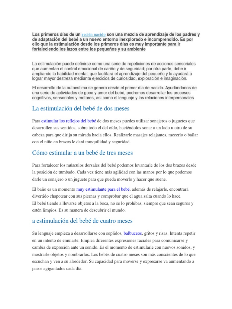 estimularán sus sentidos. el bebé se sienta de una manera más equilibrada y muestra determinación cuando quiere algún juguete que está fuera de su alcance. piernas y es una etapa ideal para estimular su gateo. El bebé puede alterarse si le dejan solo. peines. jugar a dar y tomar juguetes o que vea cómo te pasas objetos de una mano a otra. libros. a mirarse en el espejo. etc. a jugar de decir su nombre. Se altera si le dejan solo. Puedes tumbar al bebé boca abajo y dejar un jueugete cerca de él para que intente cogerlo. Los juegos de objetos que forman torres son ideales para ejercitar su curiosidad y habilidade . En esta etapa los bebés disfrutarán plenamente de juegos sociales como “palmas palmitas”. con atención. La estimulación del bebé de seis meses Para ayudar al bebé a desarrollarse se pueden realizar ejercicios de estimulación como jugar con él delante del espejo para que comience a reconocer su propia imagen. lo entretendrán y además. El bebé tiene más control en sus manos. apretar. Al bebé le encanta tirar objetos e incluso alguna comida de su plato. darle masajes o dejar que toque objetos de diferentes texturas son actividades que relajarán al bebé. ya que el bebé se mostrará inquieto. abrir. eso será un juego. Para él. etc. Estimulación del bebé 8 En esta etapa es muy importante que se estimule y se ofrezca seguridad a los bebés. cepillos. Intentará de todas formas alcanzarlo. sin tener percepción sobre los peligros. Cantar al bebé. Estimulación del bebé a los 7 En su séptimo mes de vida. Para estimular a un bebé de 7 meses es necesario contestar a su llanto y a sus necesidades. curioso. tirar. Observan dibujos e ilustraciones en libros o revistas. paciencia y cariño. Se debe ‘vestir’ la casa de seguridad en los enchufes. su motricidad fina.5 meaes Cada vez el babé tiene más capacidad para jugar y relacionarse por lo que los juegos de estimulación son ideales para esta etapa de su vida. etc. Le interesará romper papeles más finos. En esta etapa. El bebé intentará llevarse todo lo que encuentre a su paso a la boca: cucharas. ponerle música clásica. en las esquinas de los muebles. así como sus piernas. el bebé ya consigue amasar. a repetir lo que le dicen.
