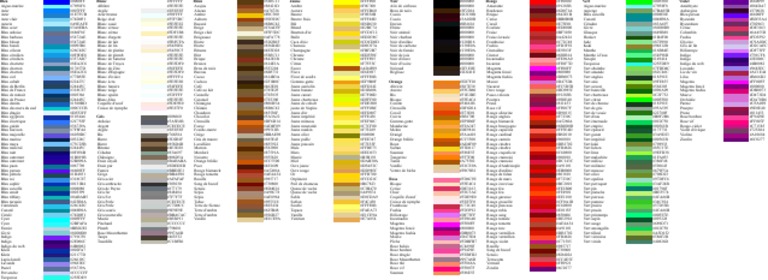 Aigue-marine #79F8F8 Albtre #FEFEFE Acajou #88421D Ambre #F0C300 Aile de corbeau #000000 Amarante #91283B Aigue-marine #79F8F8 Amthyste #884DA7