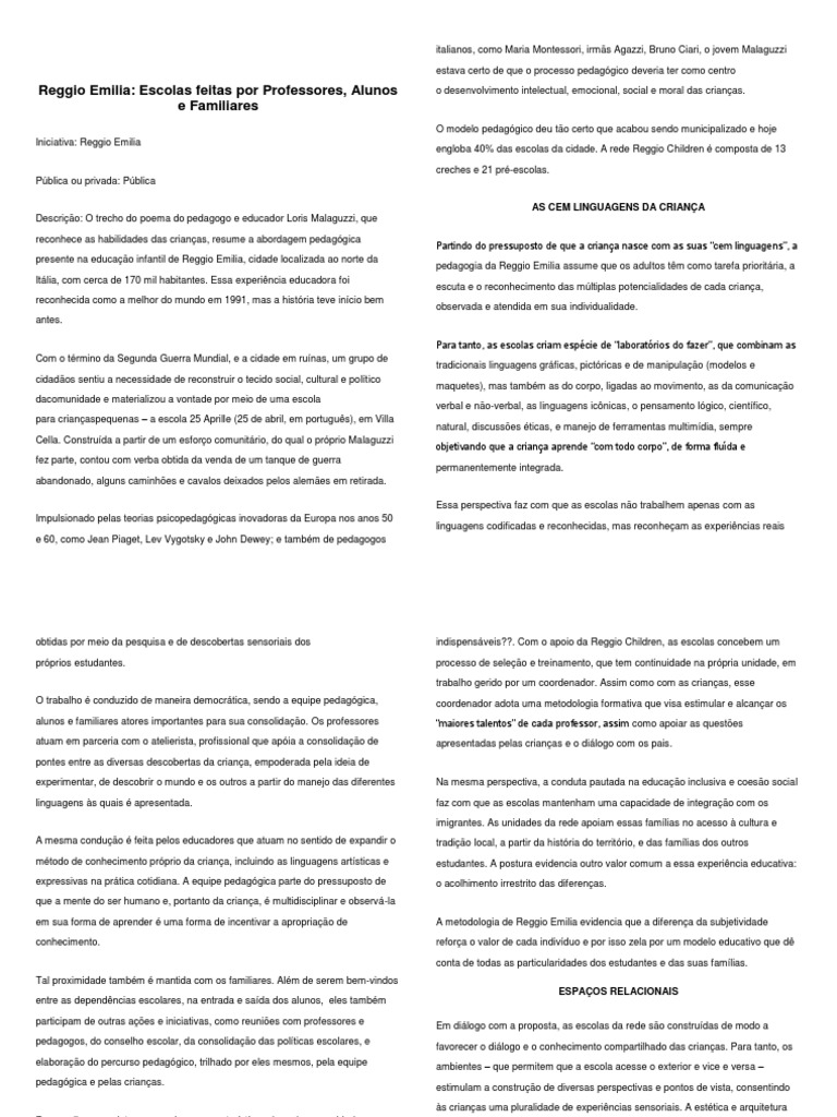 Reggio Emilia: Escolas feitas por Professores, Alunos o desenvolvimento intelectual, emocional, social e moral das crianas.