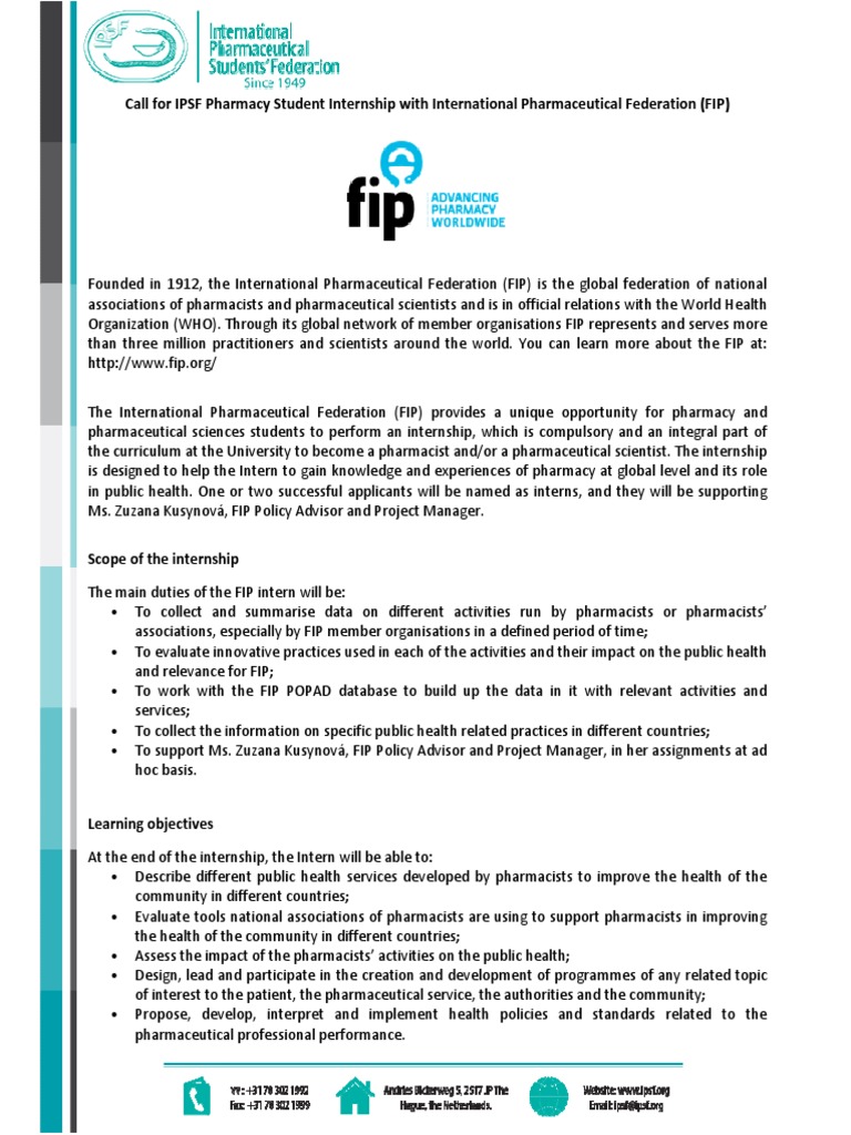 FIP Internship 2017. Only PDF format of all applications will be accepted.