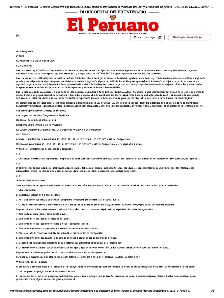 pe/normaslegales/decreto-legislativo-que-fortalece-la-lucha-contra-el-feminic-decreto-legislativo-n-1323-1471010-2/ 5/5 .… http://busquedas.com.DECRETO LEGISLATIVO .elperuano.16/9/2017 El Peruano .Decreto Legislativo que fortalece la lucha contra el feminicidio. la violencia familiar y la violencia de género .