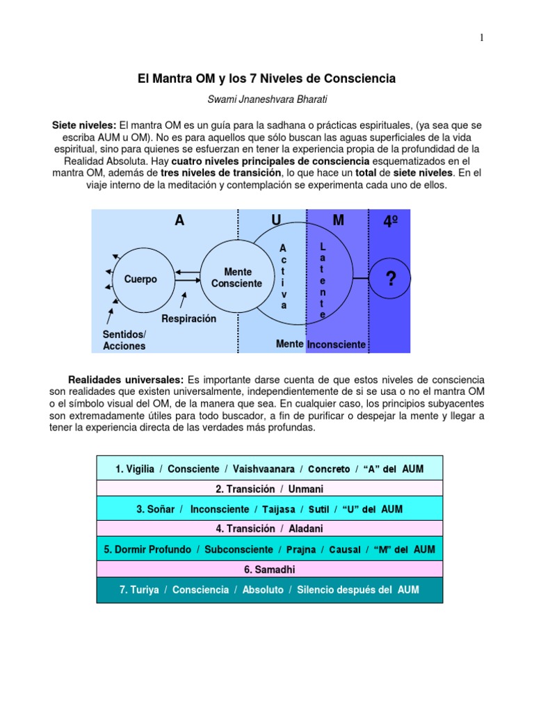 El cuadro que se muestra a continuación se puede imprimir y llevar consigo. ishvara y brahman. . del Dormir Profundo. prajna. U y M del mantra OM) El arco bajo el punto simboliza la separación de este cuarto estado. Inconsciente. y turiya. 3 Los 7 Estados de Consciencia en el Mantra OM En este artículo se describen 7 estados o niveles de Consciencia. llamada Turiya. que se relaciona con la conciencia propiamente tal. así como vaishvanara. Cuarto estado. a fin de memorizar las partes del OM. impregna. denso Otros nombres para los cuatro niveles: Otros textos y enseñanzas pueden usar distintos nombres al referirse a las características de estos cuatro niveles. (A del mantra OM) La curva central representa el nivel Sutil. Significado del símbolo: Los cuatro niveles de consciencia son representados por la vibración sonora del AUM/OM y también por su símbolo visual. Prajna Bindu (Semilla de mostaza). lo cual sucede luego de seguir el proceso de despertar kundalini. del Soñar. la consciencia absoluta que abarca. La curva inferior representa el nivel Concreto. Atman/Brahman. (U del mantra OM) La curva superior representa el nivel Causal. y aún así siempre sigue siendo parte de los otros tres. y es los otros tres. que se mantiene por encima. el Ser Taijasa Soñar Inconsciente Activo Mundo Sutil Vaishvanara Estado de Vigilia Mente Consciente Mundo Material. Estado de Dormir Profundo Turiya. Tres estados de Consciencia: Cada uno de los tres sonidos del mantra AUM (A. llamado Prajna. el Cuarto. llamado Vaishvanara. (M del mantra OM) El punto o Bindu representa el cuarto estado. Cuarto estado de Consciencia: Luego de esas tres partes del mantra OM existe un Silencio. taijasa. llamado Taijasa. hiranyagarbha. Atravesar el bindu permite acceder finalmente a la experiencia suprema. de Vigilia. Inconsciente Latente Realidad Absoluta. Por ejemplo: virat. (Silencio después de la A. U y M) simboliza un estado de consciencia específico. Plano Causal Consciencia Pura. Tres estados de transición: Entre estos cuatro estados de Consciencia hay tres estados de transición. Consciente. Subconsciente.