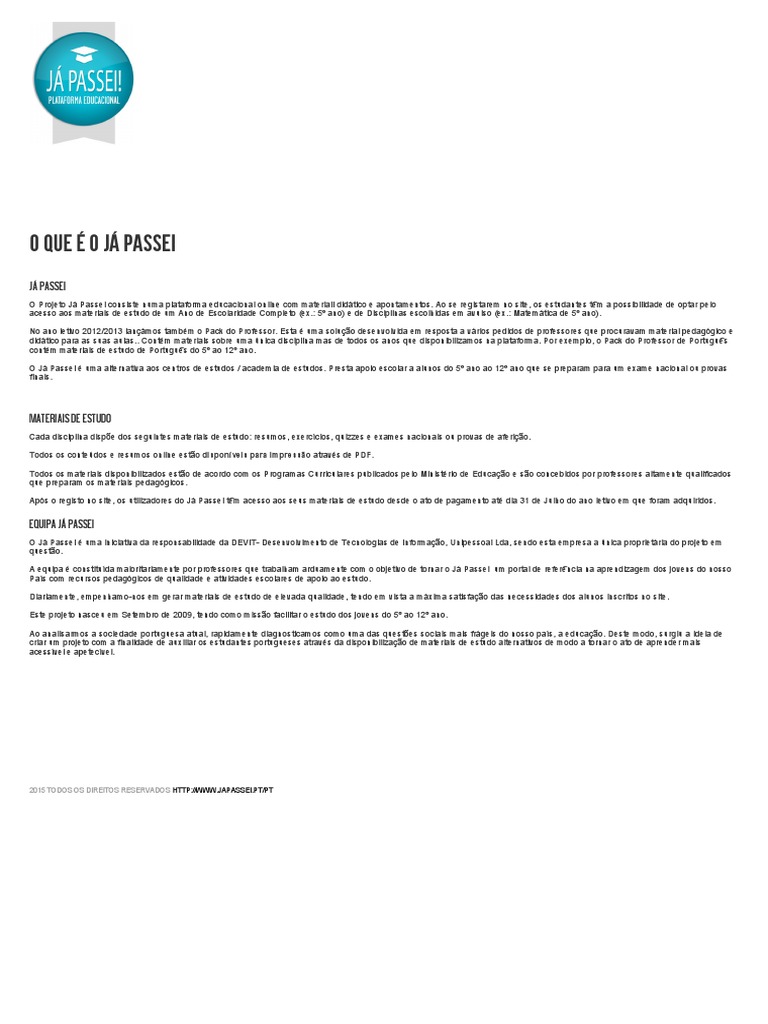 O Projeto Já Passei consiste numa plataforma educacional online com materiail didático e apontamentos. Ao se registarem no site, os estudantes têm a possibilidade de optar pelo