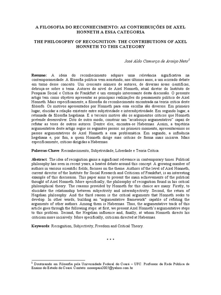 Honneth. Mais especificamente, a filosofia do reconhecimento encontrada na teoria critica deste