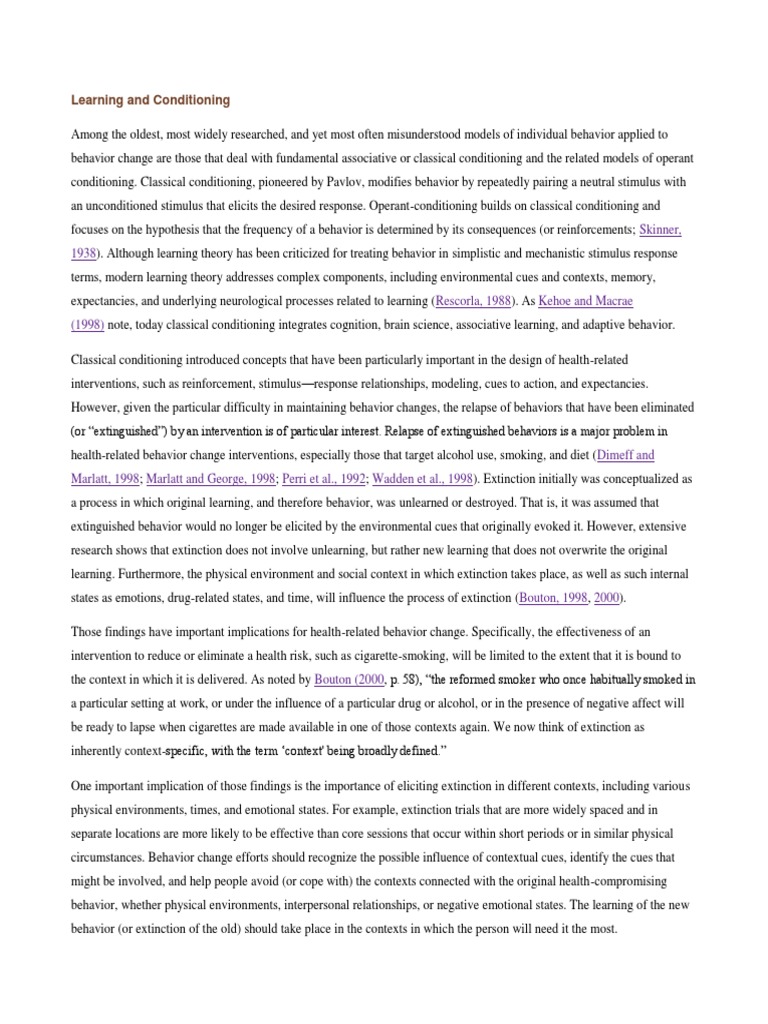 expect to benefit if they change their behavior. Self-regulation is a concept that derives from cognitive social learning theory (see Bandura. p.. and it includes what many people call “will power. the most important prerequisite for behavior change is a person's sense of self-efficacy or the conviction that one is able successfully to execute the behavior required to produce the desired outcome. and managing stress. It is as if the learning and memory system is organized with a default assumption that the first-learned thing is correct. behaviors. and perceive their social environment as encouraging the change. 2000.. Ewart. not the second things. A growing body of literature supports the importance of self-efficacy in initiation and maintenance of behavioral change (Bandura. but if they lack a belief that they can indeed change. engaging in regular exercise. Kaplan et al. Self-regulation can be critical in such health-protective and health-maintaining behaviors as eating a healthy diet. 61): [F]irst-learned things seem much more likely to generalize over place and time. 1987. 1986. Baumeister et al. Substantial empirical evidence suggests that self-efficacy beliefs (and the related concept of optimism) are reliable predictors of behavior. their efforts are not likely to succeed. 1990). Bandura et al. that original learning of a behavior readily generalizes across contexts.. including a number of health-related behaviors (e. 1986.. 1998. 1999.. 1986. Scheier et al.. Carver and Scheier. Strecher et al. but that behavior changes with observations of others. namely. The evidence that extinction depends on context is but one of several important results from basic research on learning and conditioning with important implications for explaining health-related behavior change. Cognitive Social Learning Cognitive social-learning theory (e.. 1997).g. Compas et al. One way of thinking about research on behavior change is that the organism seems to treat the second thing learned about a stimulus as a kind of exception to a rule. 1997) proposes that reinforcements are not the sole determinants of behavior. 1977. and that they mediate the effects of intervention on behavior change. 1999). According to cognitive social-learning theory. Eisenberg et al. 1994. modulation. or redirection of a person's emotions.. modification. place.” behavioral interventions that are informed by recent developments in learning theory and other fields of basic behavioral science.” Self-regulation includes cognitive and behavioral processes that involve the initiation. That perspective provides support for the importance of preventive interventions that promote health-enhancing behaviors.. Wiedenfeld et al. People can feel susceptible to an illness.Marlatt and Gordon. 1998. 1985. One implication of this is that if we really want to reduce cardiovascular risk. the failure or breakdown . or environment (Compas et al. physiological responses. Closer ties between intervention research and basic learning theory and research could contribute to what O'Donohue (1998) called “third-generation behavior therapy.There is another important difference between original learning and extinction. 1989. whereas extinction does not (Bouton. 1986).. Bandura.. or time. Conversely. 1977. and everything else is conditional on the current context. thoughts. we should arrange a world in which healthy behaviors are the first things.g. learned. delay. as opposed to interventions designed to treat or change health-compromising behaviors. termination. 1995.