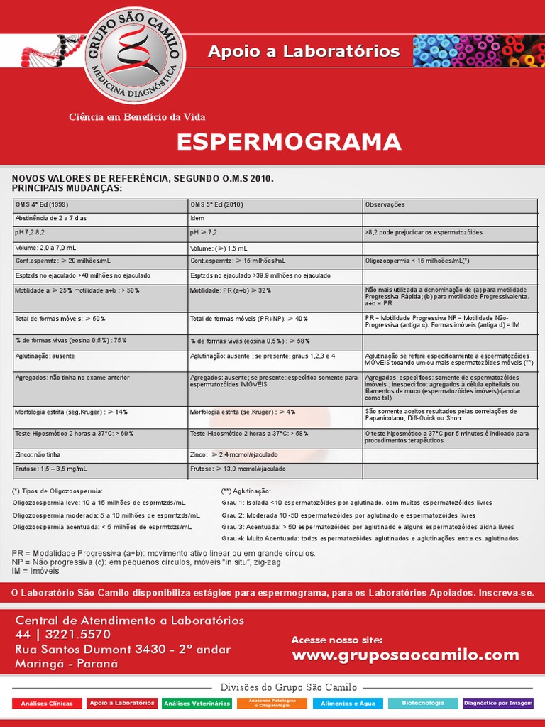 Total de formas móveis: ≥ 50% Total de formas móveis (PR+NP): ≥ 40% PR = Motilidade Progressiva NP = Motilidade Não-