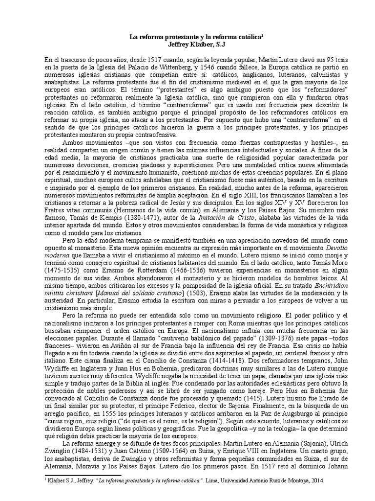 Klaiber S.J., Jeffrey. “La reforma protestante y la reforma católica”. Lima, Universidad Antonio Ruíz de Montoya, 2014.