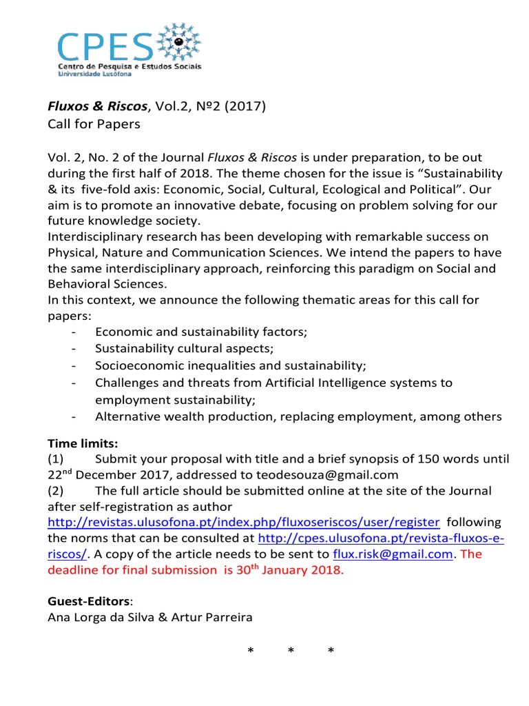 Vol. 2, No. 2 of the Journal Fluxos & Riscos is under preparation, to be out during the first half of 2018. The theme chosen for the issue is “Sustainability & its five-fold axis: Economic, Social, Cultural, Ecological and Political”. Our aim is to promote an innovative debate, focusing on problem solving for our future knowledge society. Interdisciplinary research has been developing with remarkable success on Physical, Nature and Communication Sciences. We intend the papers to have the same interdisciplinary approach, reinforcing this paradigm on Social and Behavioral Sciences. In this context, we announce the following thematic areas for this call for papers: