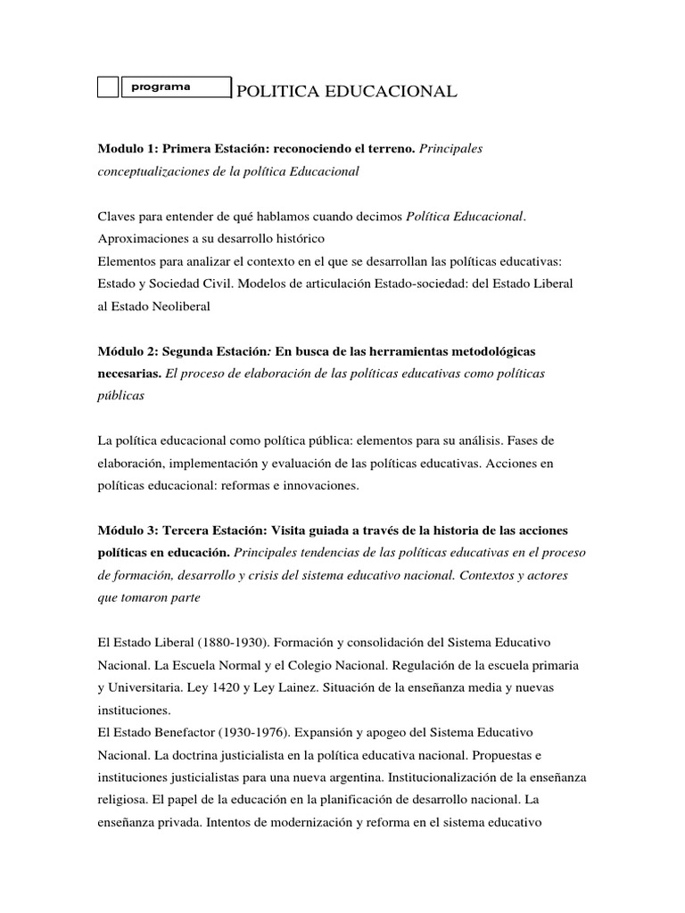 Banco Mundial. Descentralización del sistema educativo argentino: Ley Federal de Educación Nº 24. El Congreso pedagógico Nacional. Crisis del Estado Benefactor. Nuevas regulaciones del Sistema Educativo Nacional. OCDE. un panorama desde la cima. nuevo escenario para pensar la ecuación. La agenda educativa en la Argentina posneoliberal del S.195/93 y Ley de Transferencia Educativa N° 24. Antes de que decline el crecimiento del sistema educativo: Educar para la liberación (1973-1976). Políticas y estrategias de cambio a nivel nacional e internacional. Educar para la democracia (1983-1989): Políticas educativas en la transición a la democracia Principales problemas y desafíos para la educación. Ley Orgánica de Educación.521/95. Módulo 4: Cuarta Estación: Luego de un largo recorrido. Social o Neoliberal en el contexto de la globalización.nacional. . Las políticas educativas en las últimas dos décadas El Estado Post. La agenda de los organismos internacionales: UNESCO. CEPAL. El sentido de la educación en el gobierno de facto: Educar para el orden. Transferencia de los servicios nacionales a las provincias y a la Municipalidad de Buenos Aires (1976- 1983). Políticas Universitarias: Ley de Educación Superior Nº 24. Reforma Educativa.049/91. XXI a partir de las nuevas relaciones Estado-Sociedad.