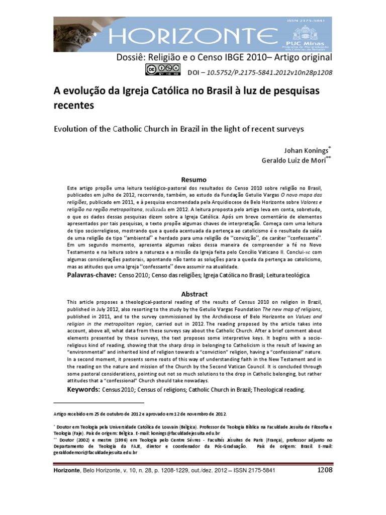 Keywords: Census 2010; Census of religions; Catholic Church in Brazil; Theological reading.