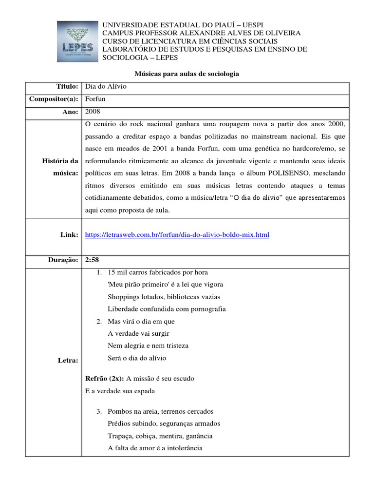 cotidianamente debatidos, como a música/letra “O dia do alívio” que apresentaremos