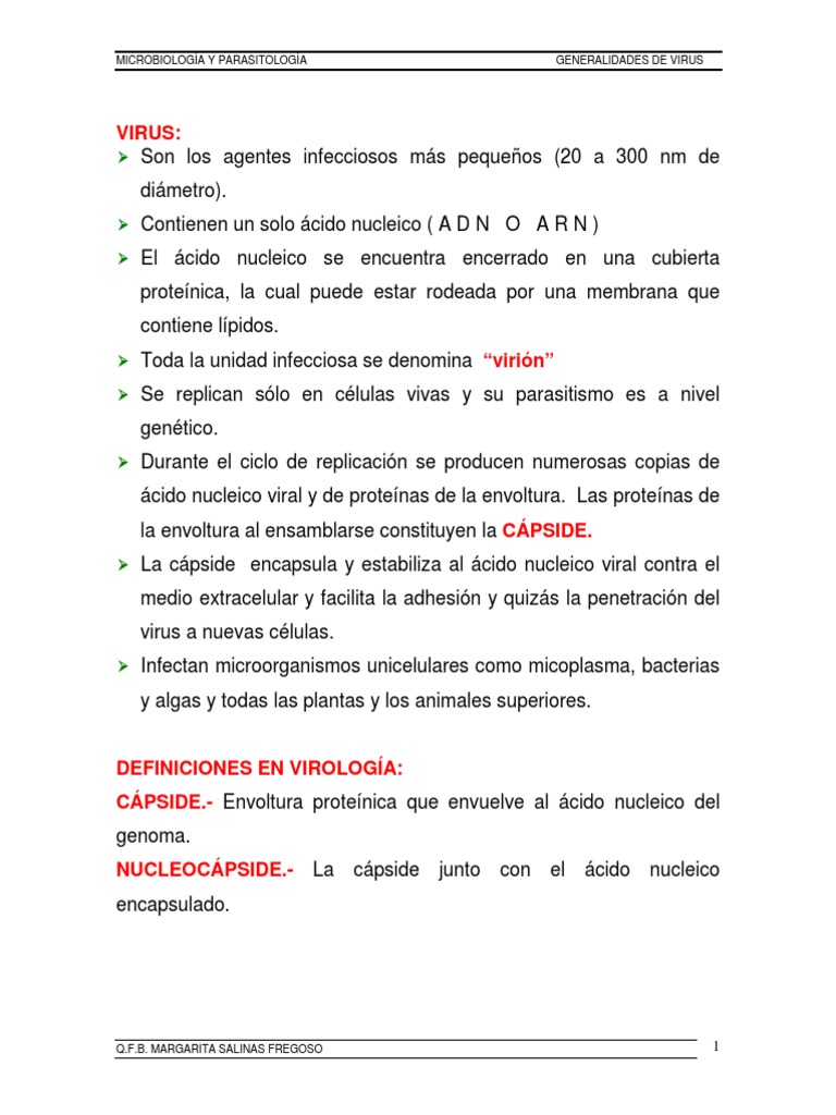 Su finalidad principal es facilitar la transferencia del ácido nucleico viral de una célula huésped a otra. ♦ Simetría helicoidal (Ortomyxovirus).Sedimentación en la ultracentrífuga.. MARGARITA SALINAS FREGOSO 9 .PROTEÍNAS. Sirven para proteger al genoma viral contra la inactivación por las nucleasas.B.Filtración a través de membranas de porosidad graduada. Codifica la información genética necesaria para la replicación del virus. ♦ Con estructura compleja (Poxvirus).F. COMPOSICIÓN QUÍMICA DE LAS PARTÍCULAS VIRALES: A... el metal pesado penetra la partícula viral y resalta la estructura superficial de los virus mediante “tinción negativa”.ÁCIDO NUCLEICO. circular o lineal. Q. de colorantes con metales pesados para acentuar la estructura de la superficie. participan en la adhesión de la partícula viral a una célula sensible y proporcionan la simetría estructural de la partícula viral. TAMAÑO DE LOS VIRUS: A.MICROBIOLOGÍA Y PARASITOLOGÍA GENERALIDADES DE VIRUS ESTRUCTURA VIRAL: El estudio de la simetría viral requiere el uso del microscopio electrónico. C...Los virus contienen una sola clase de ácido nucleico ya sea A D N o A R N. B. Existen tres tipos: ♦ Simetría cúbica (Adenovirus). El genoma puede ser de una sola tira o de doble tira. B.La microsocopía electrónica es el método más utilizado. segmentado o no...