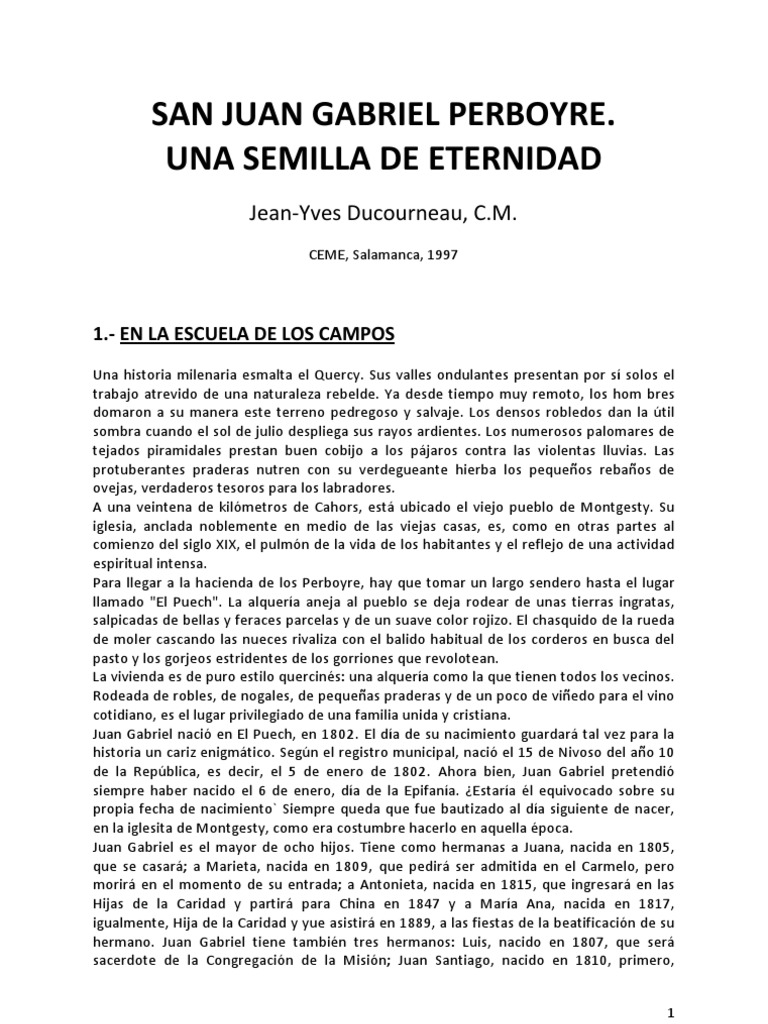 Dado su estado de salud. pero su decisión. En efecto. Al volver a Saint-Flour. bien rodado ya por la experiencia de Saint-Flour. todavía poco numerosos por entonces. finalmente. formar las nuevas generaciones de misioneros. le manifiesta su deseo ahora ya maduro. sacerdotes de todas las edades. por consiguiente. no debernos tener miedo a morir por Él”. Su primera misión es. Juan Gabriel.Tal vez. El obispo de Saint- Flour. 5. trece años mayor que él. del riesgo. a Juan Gabriel se le confía el cargo de subdirector del Seminario Interno de la Congregación. aunque en vano. Es la última vez que ve a sus padres y a sus amigos de Montgesty. pero teniendo en cuenta también sus cualidades intelectuales y pedagógicas. Entre los candidatos al ingreso en la Congregación de la Misión. deseosos de agregarse a la Compañía. sin hablar del clima difícil de soportar y. pero también. en Montauban. al fin. Allí está -se estima-. P. tengo ya más de treinta años. se esconde en realidad una voluntad resisten te a toda prueba y un carácter de acero. lo encuentra en el despacho del Ecónomo General de los PP. tan difícilmente aceptada. Es un puesto de primer plano el que le han confiado.. Va a ver a su tío. con algunas clases de sagrada Escritura. no dice palabra y tiene un aire modesto y retraído. como una luz que proporciona una certeza a Juan Gabriel: irá a China. y aún no he aprendido a vivir ¿Cuándo.. lo ha conocido pronto y llega a apreciarlo viendo en él un santo. sin embargo. ¡Cuál no es su sorpresa al saber que está en presencia de su futuro subdirector! Este sacerdote. pero que es difícil de doblegar. Un sacerdote. que han pasado como un sueño. se encuentra con una carta de sus superiores de París. se encuentran algunos jóvenes llegados de los seminarios mayores diocesanos.. Paúles. Bajo su aspecto frágil. aprenderé a morir?" La muerte de Luis. reclama otra pedagogía. Durante el verano de 1832. cualesquiera que sean los peligros y persecuciones. Son momentos más tristes que loa precedentes. vestido muy sencillamente. en París. pasa una temporada en El Puech. cuando juzga que debe ser firme e 11 . pues. pues. como el director titular es un sacerdote de edad y achacoso. no menos considerable. se dice de Juan Gabriel que respeta a todos. que aprecia mucho al fogoso director de su Pensionado. el mismo día. viene a ser. Se trata ahora de un alumnado muy diferente del que habitaba el Pensionado eclesiástico anterior y que. coge la pluma para escribir a su tío Santiago: "No dudo de que Luis goce ya de la gloria celeste. Juan Bautista Étienne. y lo toma por un hermano coadjutor. el peso del cargo va a recaer sobre las espaldas de su adjunto. Juan Gabriel ha permanecido casi seis años en Saint-Flour. Por los pasillos de san Lázaro.UNA ESPIRITUALIDAD DEL DON FÉRTIL "Mi nuevo empleo es más favorable que el antiguo a mi salud que ahora va bastante bien". Santiago le objeta que su salud da rápidamente signos de fatiga. candidato a la admisión. ¡Que no se me encuentre digno de ir a llenar el puesto que él deja vacante! ¡Ay. A los treinta años. tiene que desplegar todo su carisma y su energía para afirmarse. y ha marcado para siempre la historia y la tierra de esta diócesis de la Alta Auvernia. de la muerte por persecución: "Es todo lo que yo deseo -habría replicado entonces-. su justo sitio. Juan Gabriel se alegra de su nombramiento como subdirector del Seminario Interno. puesto que Dios ha querido morir por nosotros. para retenerlo en su diócesis. En efecto. está tomada. emplea todos los medios de persuasión posibles.