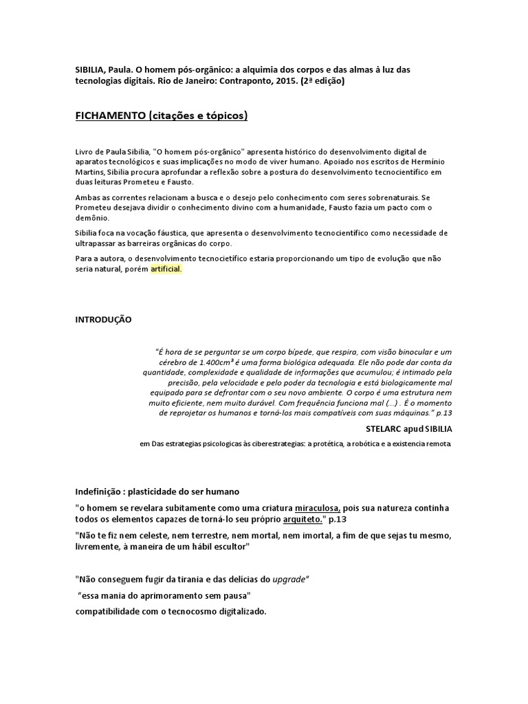 Martins, Sibilia procura aprofundar a reflexão sobre a postura do desenvolvimento tecnocientífico em