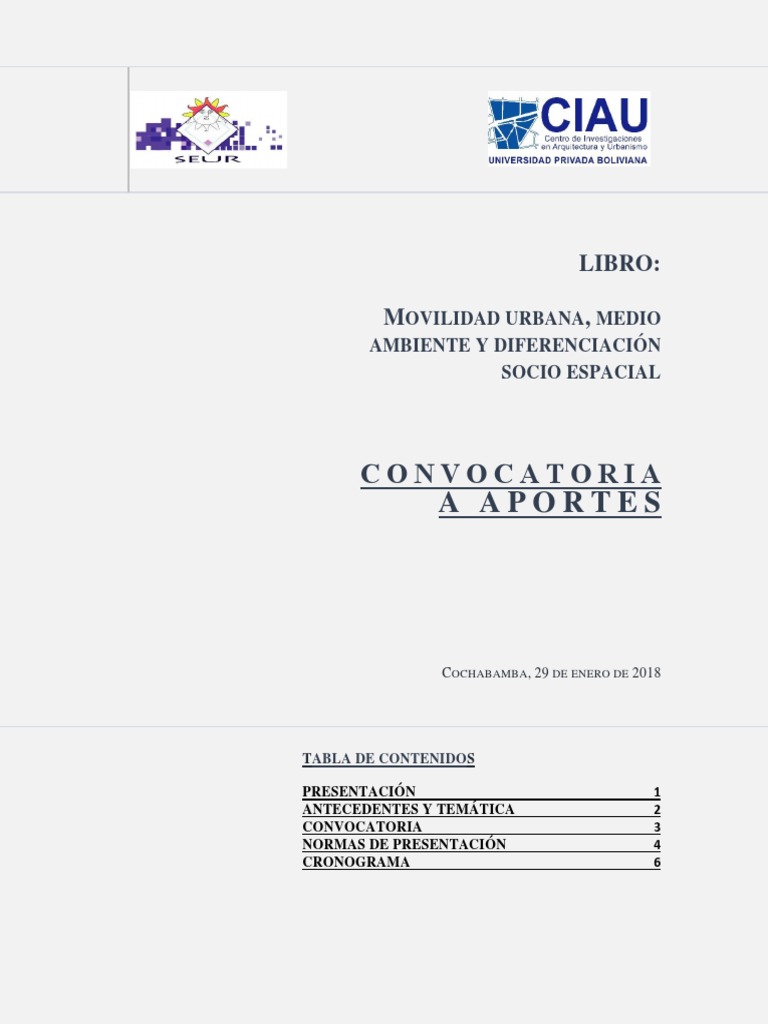 URBANIZACIÓN Y DIFERENCIA SOCIO ESPACIAL Se espera artículos. medio ambiente y diferenciación socio espacial. • Las iniciativas de autogestión urbana. • La planificación y gestión de la movilidad. • Los fenómenos de diferenciación socio espacial. 3 . MEDIO AMBIENTE URBANO Y SUSTENTABILIDAD iii. así como sus desafíos y avances de solución. • Los grandes proyectos urbanos. CONVOCATORIA El CIAU/UPB y la SEUR/CAC convocan a la presentación de propuestas de artículos para la publicación física y digital del libro: Movilidad urbana. • Los planes de movilidad y transporte. ciudades y la diferenciación socio espacial. • Gentrificación. • Los barrios cerrados. tanto en lo referido a su problemática. • La configuración urbana de los espacios verdes y sus servicios ambientales. • El agua y la energía en el contexto del cambio climático. • La transformación del entorno natural y sus consecuencias. • La informalidad y la producción de la ciudad. reflexiones teóricas y resultados de investigación en los campos de los temas del libro y desde una perspectiva inter/transdisciplinaria. • Trenes y transporte por cable. • La gestión de los residuos sólidos en las áreas metropolitanas. • Los mercados de suelo desregulados. • La obsolescencia de los enfoques de planificación. • El espacio público. • Otros vinculados con los temas. MOVILIDAD URBANA ii. • La arquitectura y el urbanismo sustentable. es posible considerar las siguientes discusiones: • El transporte informal. • Las políticas públicas medioambientales. Como sugerencias indicativas y no limitativas. . La publicación constará de tres partes: i.