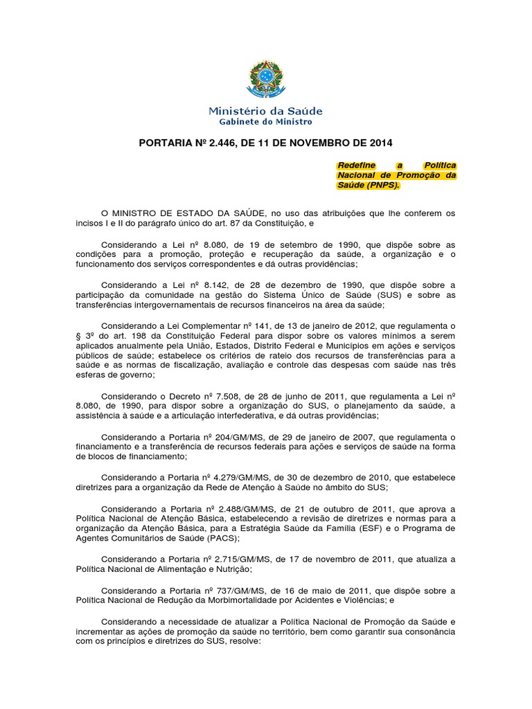 Art. 1º Esta Portaria redefine a Política Nacional de Promoção da Saúde (PNPS).