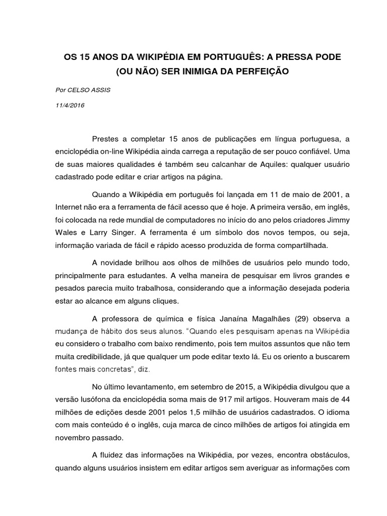 OS 15 ANOS DA WIKIPÉDIA EM PORTUGUÊS: A PRESSA PODE