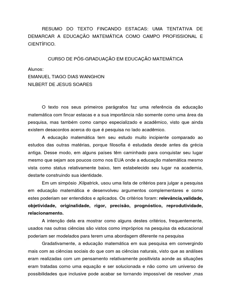 em educação matemática e desenvolveu argumentos complementares e como